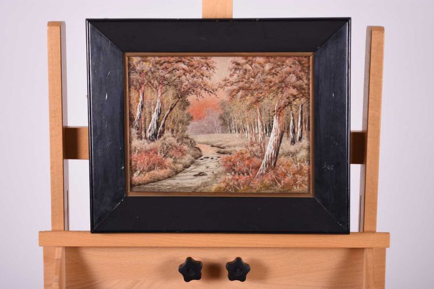 A Japanese silkwork landscape, Meiji/Taisho era, worked with a river in a wooded setting in autumnal colours, in an ebonised wood frame, 22cm x 29cm (frame 34cm x 41cm).