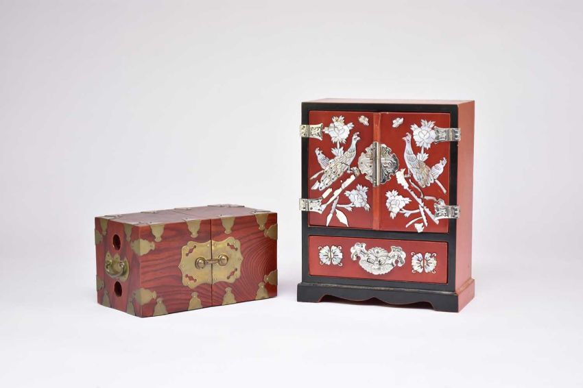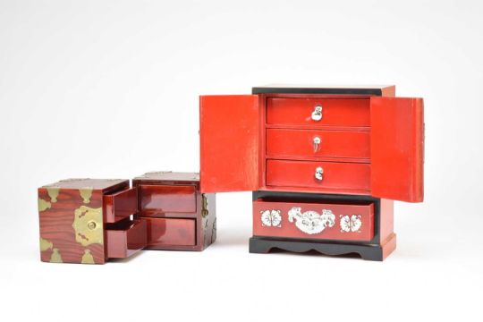 Two Korean lacquered wood jewel cases, 20th century, the first of rosewood with brass mounts, rectangular cuboid form hinging open to reveal four lacquered drawers, 19.5cm wide, the second of rectangular outline with white metal mounts, the twin doors inlaid with mother-of-peral birds, opening to three drawers, above an external drawer, 24.5cm high. (2)