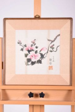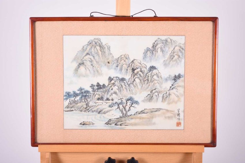 Korean School, 20th century, mountain landscape, ink and watercolour on paper, signed with one seal of the artist lower right, 32cm x 41cm, together with a study of a flowering hibiscus branch, watercolour on paper, signed lower right, 31cm x 31cm.