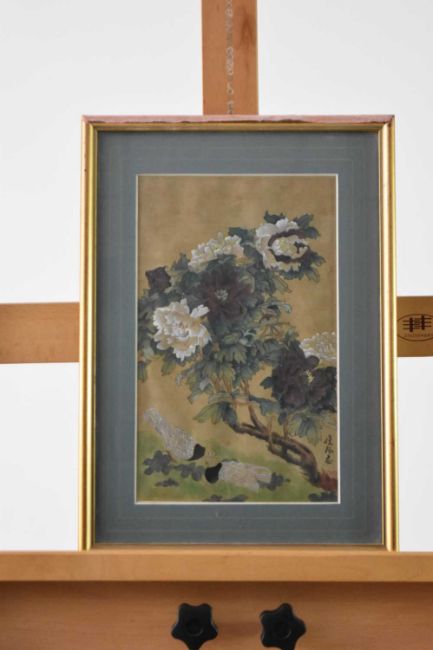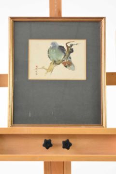 Two doves under a flowering peony, gouache on silk, 28cm x 17cm, together with another Chinese school study of a dove perched on a branch, watercolour on paper, 16cm x 22cm. (2)