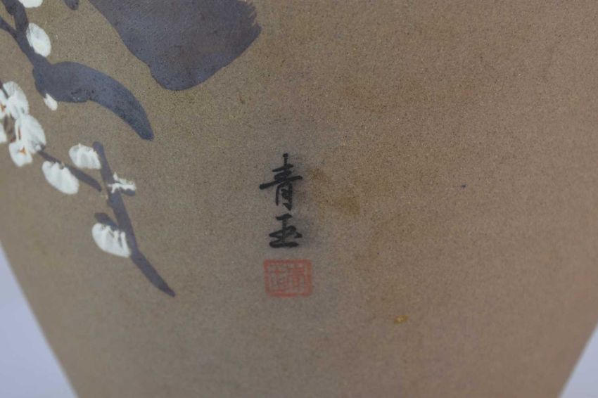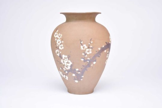 A large Korean stoneware vase, 20th century, of ovoid shape with everted rim, the mid-brown clay unglazed and decorated in coloured glazes with a flowering prunus branch, 31.5cm high, signed.