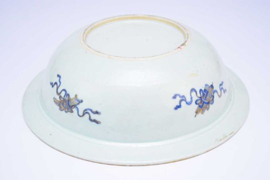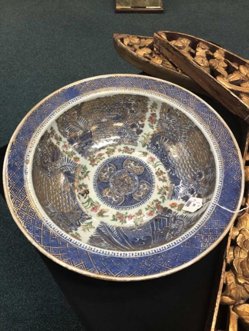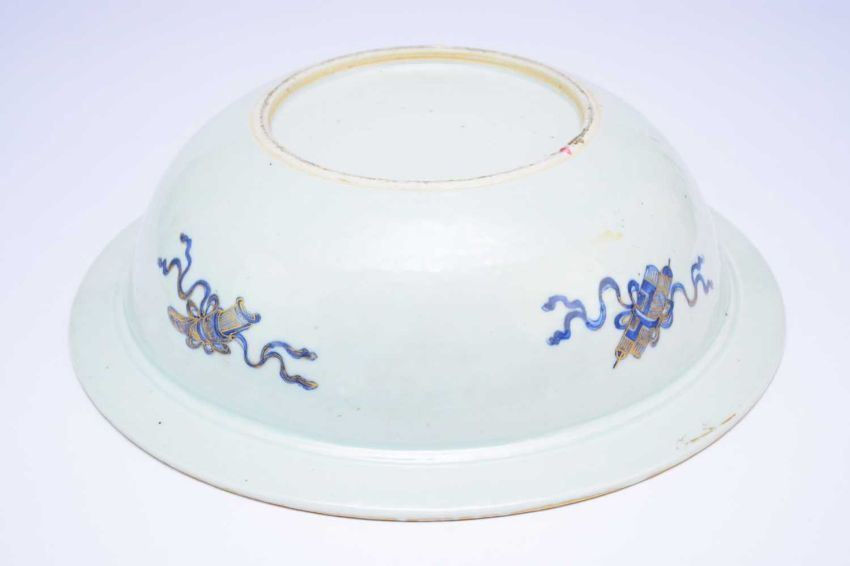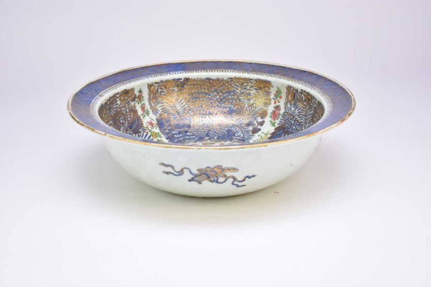 A Chinese export enamelled blue and white punch bowl, 18th century, of rounded form with broad flat rim, the inside decorated with auspicious flowers and Daoist emblems between borders of famille rose flowers, fruits and butterflies, the rim with a diaper border, the outside with four precious objects, all detailed in gilt throughout, 42cm dia.
