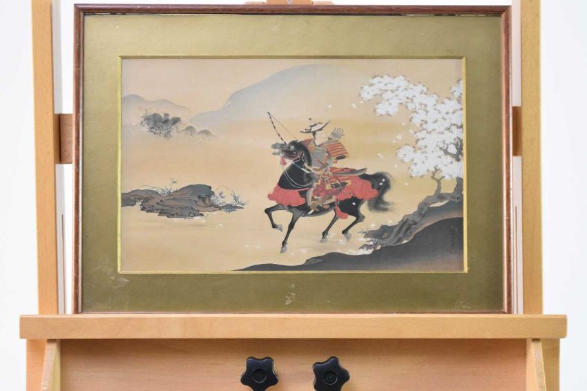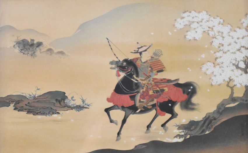 Samurai on horseback in a landscape beside a blossoming tree, watercolour on silk, signed lower right, 22cm x 36cm.