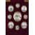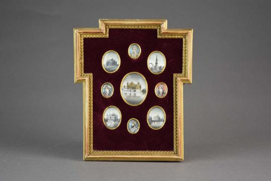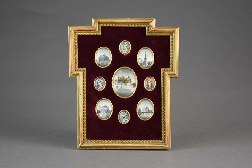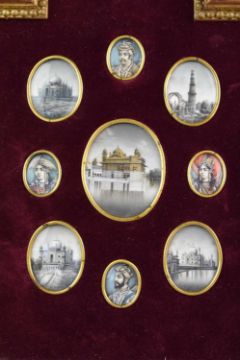 Set into a cruciform frame with red velvet mount, each painted in gouache on ivory and of oval aspect, depicting two Mughal emperors and their wives: Akbar the Great, Ruqaiya Sultan Begum, Shah Jahan and Mumtaz Mahal, along with five significant historic buildings, 2cm to 5cm, frame 20cm x 17cm.
