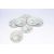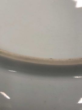 All have fritting to the rim edge. One has a hairline across the middle and a small rim chip. One has three hairlines to the rim which have been stapled and some small rim chips. One has a rim chip and associated hairline which has been stapled. One has a fine hairline to the rim and a small flat chip to the underside rim edge. One has a small flat chip to the rim edge.