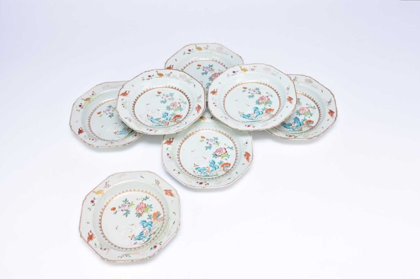 A set of seven Chinese famille rose soup plates, 18th century, of octagonal shape, painted with scenes of crane birds in a fenced garden with peony flowers, rocks and lingzhi fungus, 22.5cm dia. (7)