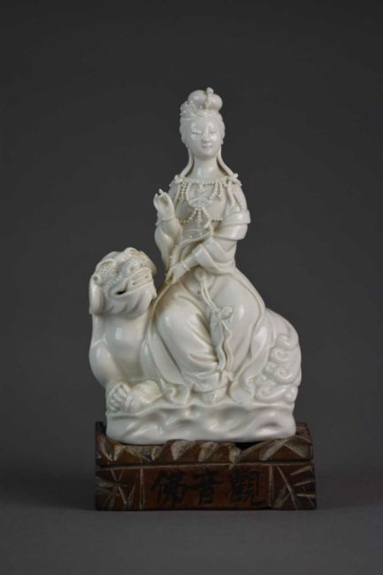 Modelled wearing traditional robes and beads, she carries a ruyi sceptre and is seated on a guardian lion, with associated carved hardwood base, 16cm high (19cm on stand).