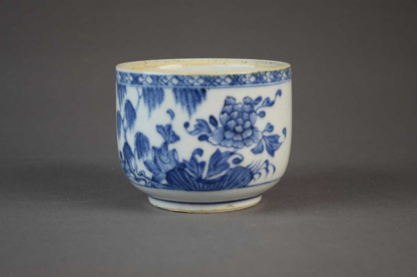Of rounded form and decorated with flowering peony, lotus and chrysanthemum plants beside a willow tree, 10cm dia. (lacking cover).