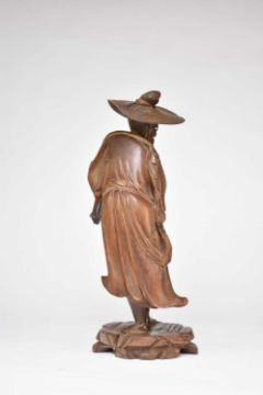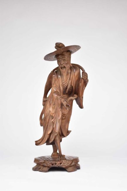 A Chinese carved hardwood figure of a fisherman, Qing Dynasty, modelled standing and carrying a caught fish over his shoulder, a pipe in his other hand, he wears traditional robes and hat, 49cm high.