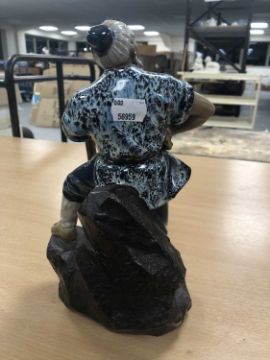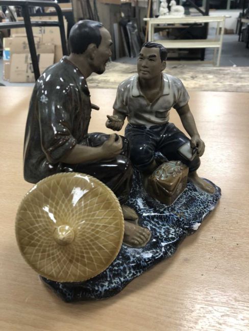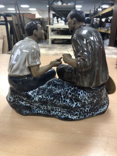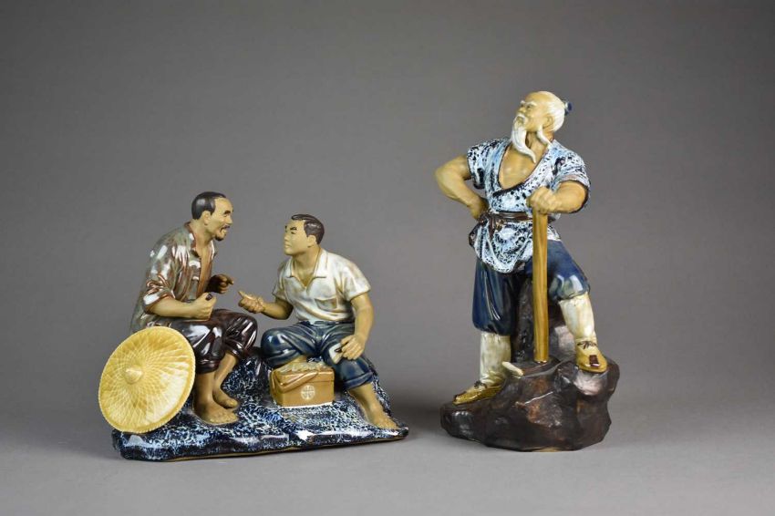 In buff clay with coloured glazes, the first modelled as two farmers seated at lunch, 19cm high, the second modelled as a man standing on a rocky outcrop holding a hoe, 26cm high. (2)