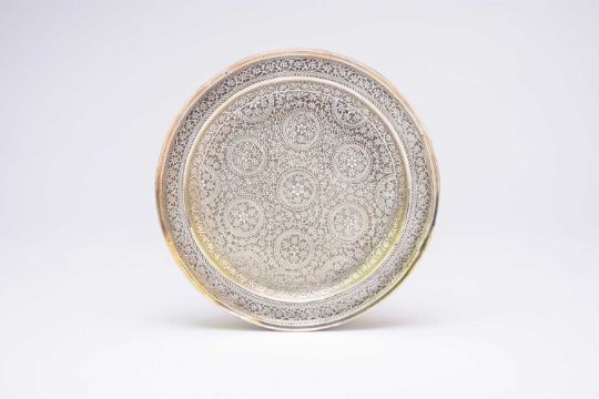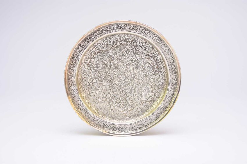 A near Eastern white metal dish, probably Indian 20th century, of circular shape with everted rim, chased all over with dense formal meandering flowers and flower bosses, 21cm dia., 12oz.