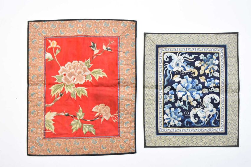 Probably garment fragments, the first worked in shades of blue with two bats amid peony flowers, 44cm x 36cm, the second in coloured threads on a red ground with peony blooms and buds on leafy branches, 51cm x 42cm. (2)
