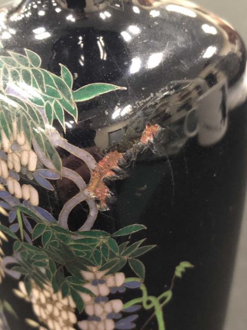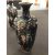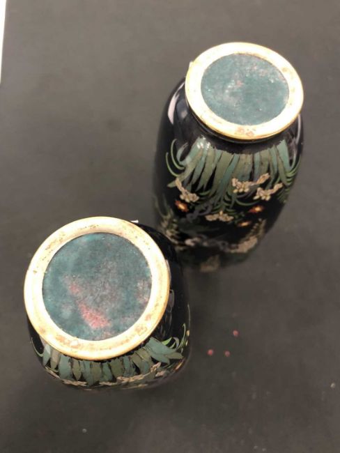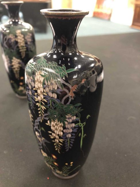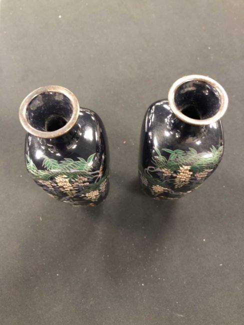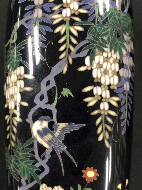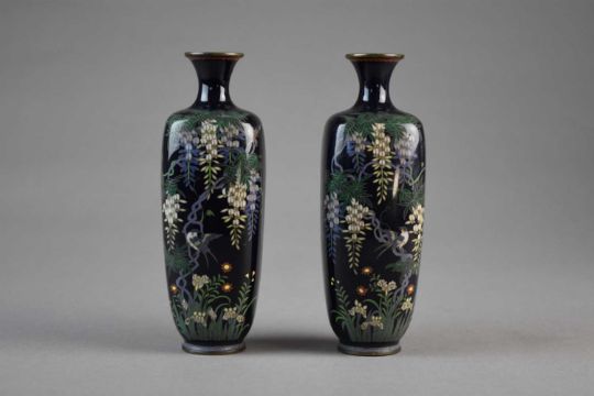 Of square section and ovoid form, worked in silver wire with birds in flowering wisteria branches on a dark blue ground, 15cm high (small chip to one shoulder). (2)