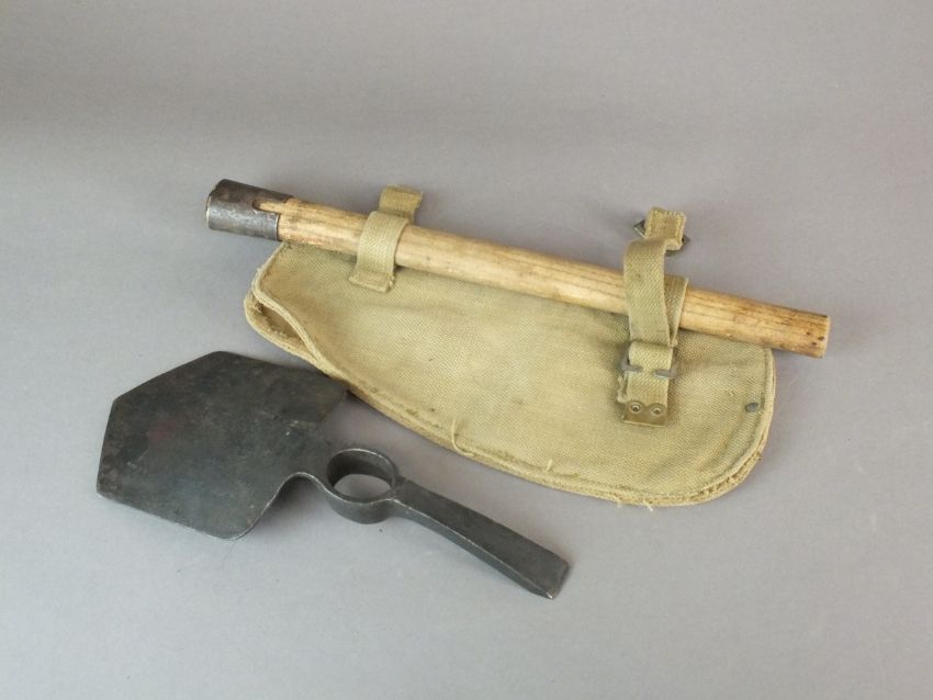 A British WW2 entrenching tool by Perks, dated 1944 below War Department arrow, comprising pick head, wooden helve and webbing cover