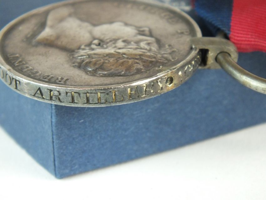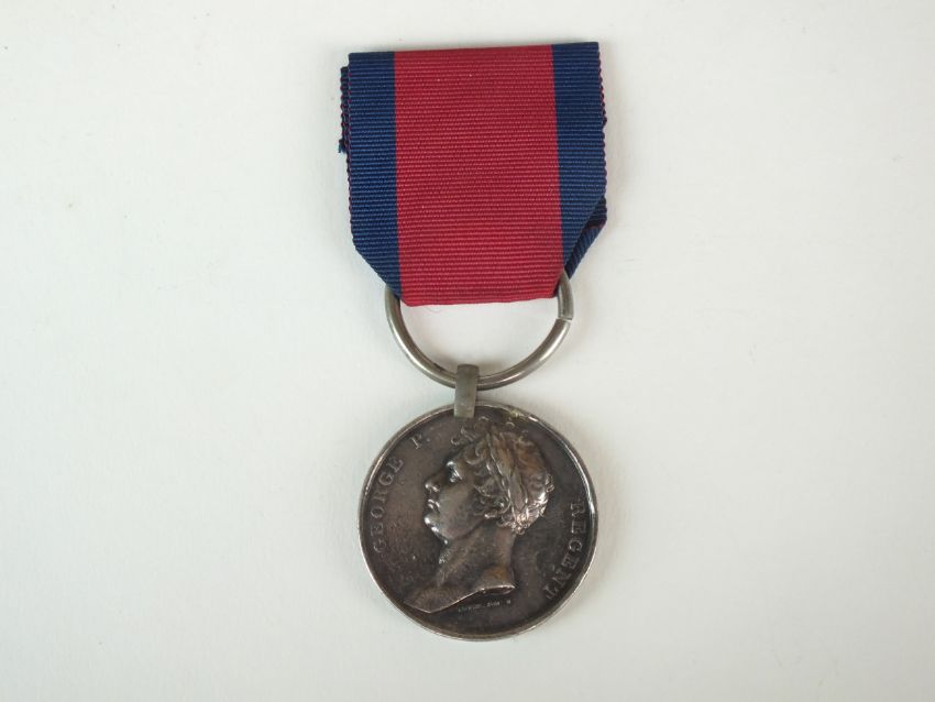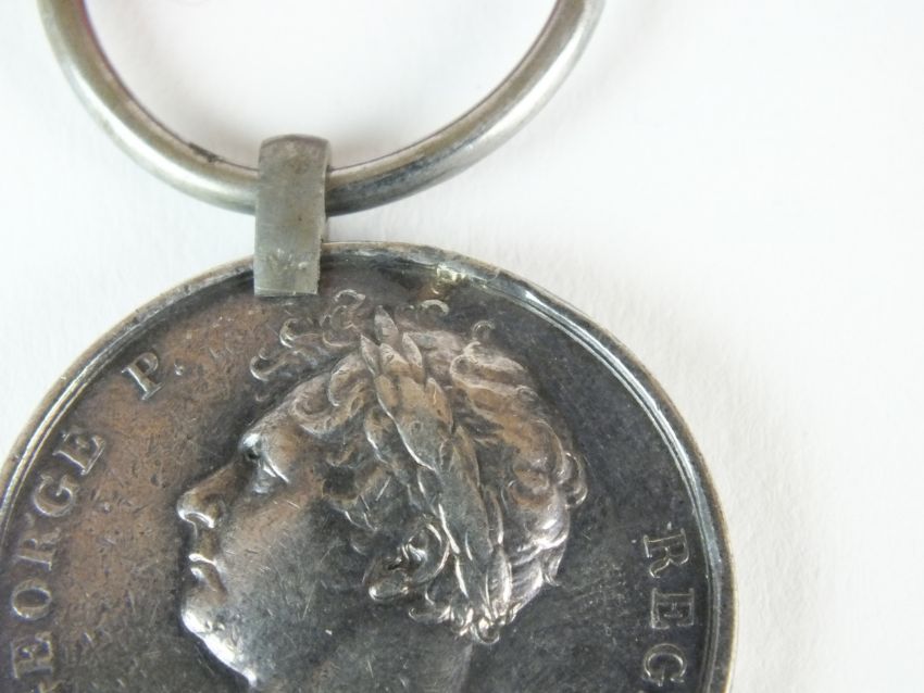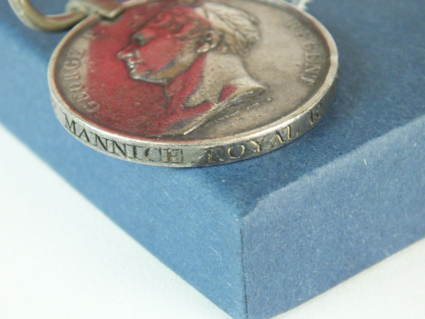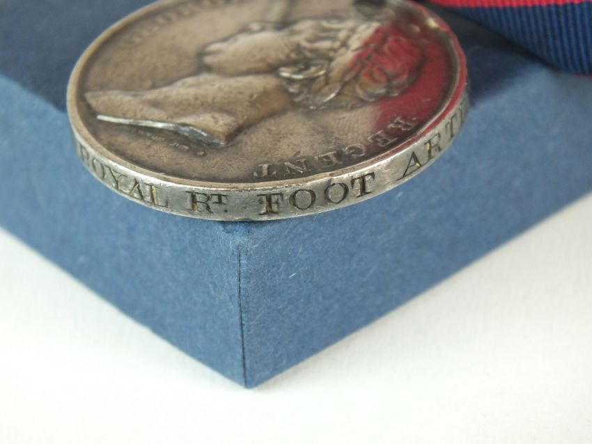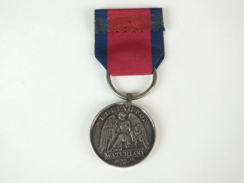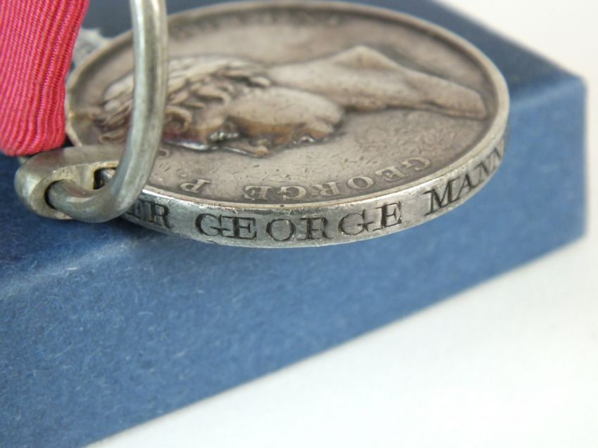 A Battle of Waterloo 1815 medal with ribbon, awarded to "Gunner George Mannice - Royal Regiment of Foot Artillery" (re-named)