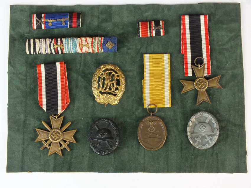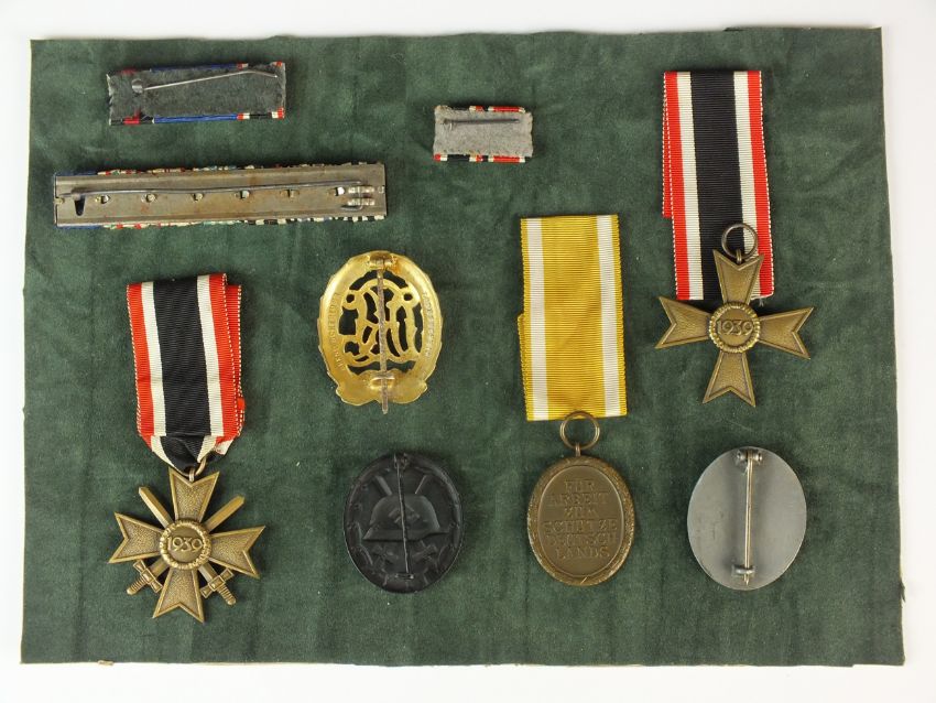A group of German Third Reich medals, awards and ribbons comprising War Merit Cross with swords, War Merit Cross without swords, wound badges in black and silver, DRL Sports Badge in bronze manufactured by Ernst Schneider; West Wall medal, oval, with the inscription "Für Arbeit zum Schutze Deutschlands" (For Work in the Defence of Germany) and three bars of medal ribbons, including Imperial German