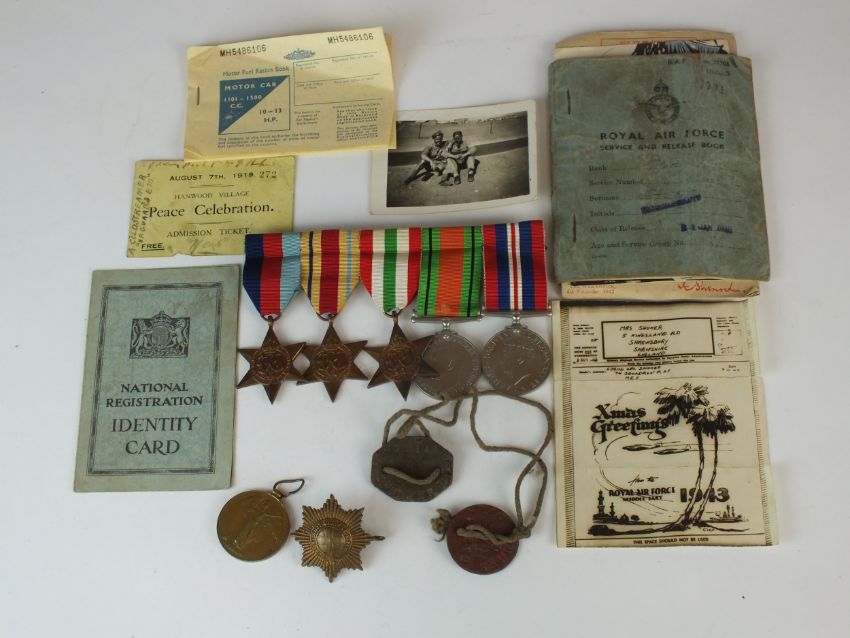 A group of five World War II medals comprising 1939-45 Star, Africa Star, Italy Star, Defence Medal and War Medal, all mounted to bar, together with an identity card, R.A.F service book, pair of dog tags named to "632114 Shuker" and a WW1 Victory Medal awarded to "10802 E.D.B.S Shuker CGDS" with cap badge