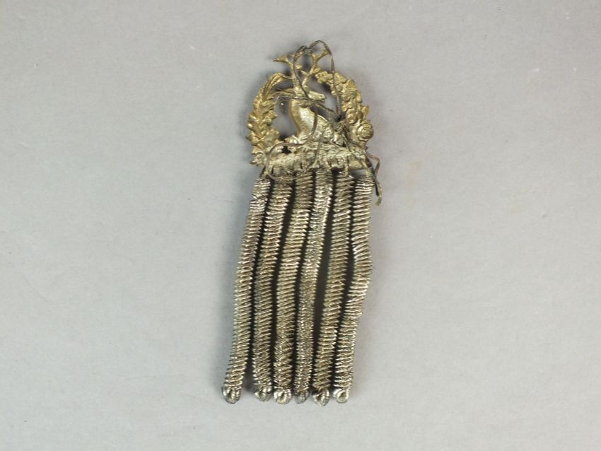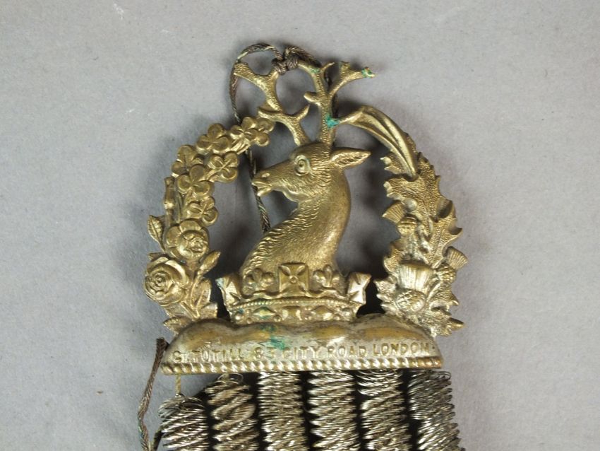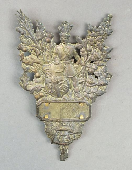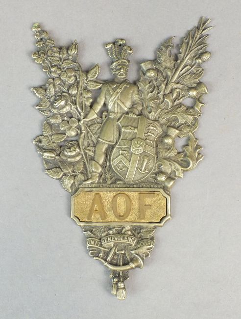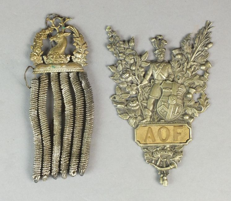 An Ancient Order of Foresters gilt brass and white metal badge, decorated with a soldier holding a shield with various decorations, standing before a bush, inscribed 'AOF' to the plaque below alongside 'G. Tutill, City Road, London', above the further motto 'Unit Benevolence Concord', overall dimensions 9cm wide and 13cm high; together with a further Foresters badge by the same maker (2)