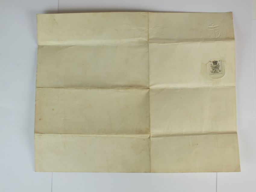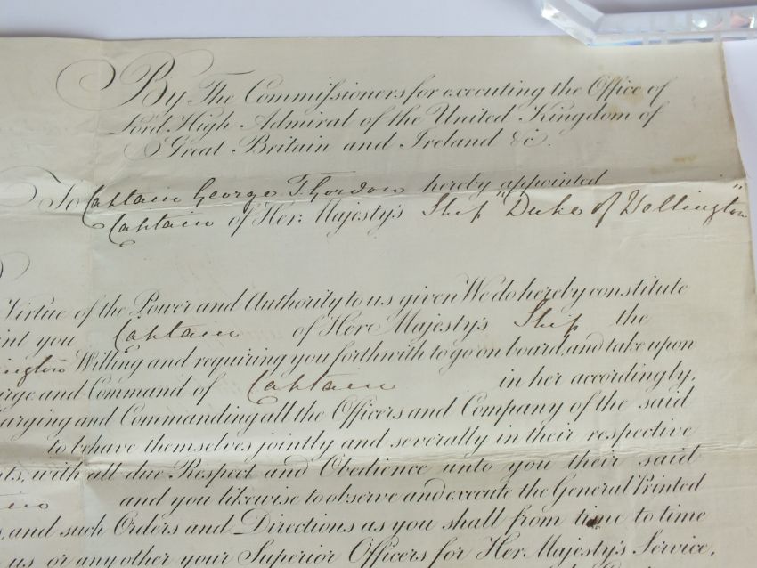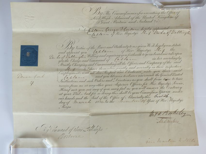A British Royal Naval Commission relating to George Thomas Gordon's appointment as Captain of HMS Duke of Wellington in 1854. With an embossed Admiralty seal to the top left corner and a five shillings Tax Stamp on the left edge. This vellum document is countersigned by: