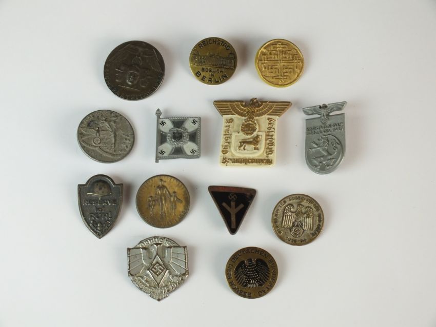 A collection of thirteen German Day Badges and tinnies comprising "Jugenfest 1937"; "Braunschweig Kriestag 1939"; "Obermollern Kr. Weissenfels" plastic day badge; "Reichstag Besuch in Berlin" brass pin; "Kinder Aufs Land" donation tinnie; "Besuch Beim Deutschen Bundestag" (Visitor to German Parliament) badge; Army Reservists tinnie; Army Banner tinnie marked "Infanterie Su 22" to verso; "Kreistag NSDAP Beg-Land 1938"; "Wir Kampften Gegen Hunger Und Kalte 1933-34"; "Reichsparteitag 1935"; a German 1933 Welfare Badge and a 1939 Ostmark-Altreich-Sudetenland National Day of Labour Badge (13)