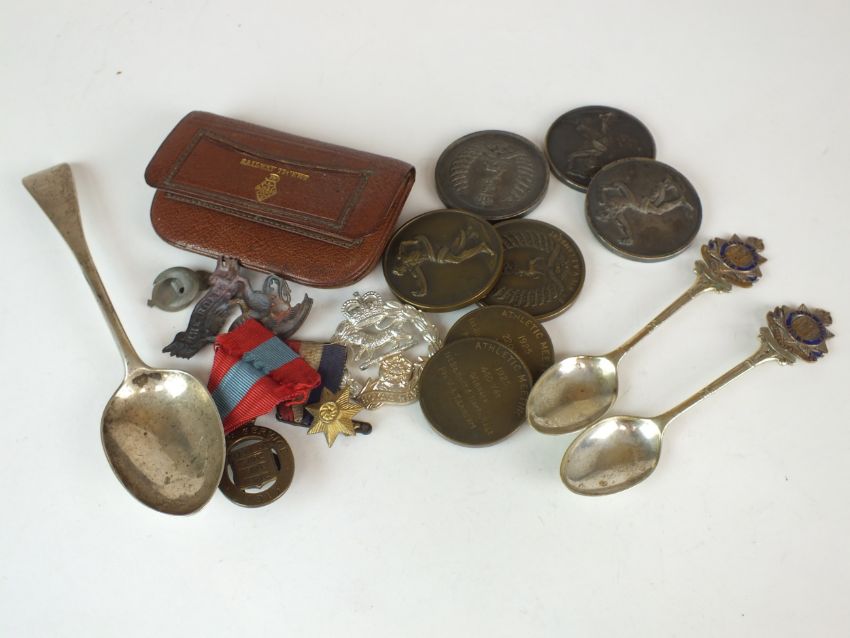 A miscellaneous collection of militaria to include a Victorian silver Old English pattern dessert spoon, London 1853, engraved 'Shropshire Militia', two silver-plated teaspoons engraved "South Africa 1900-02 23rd Bn The London Regt", five assorted cap and collar badges, a morocco purse shooting prize dated 1862 and seven athletics bronze and white metal medals awarded to Pte Lambert Bedfordshire and Hertfordshire Regiment
