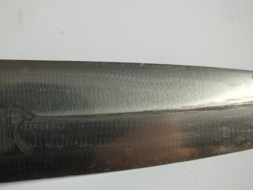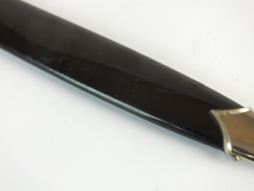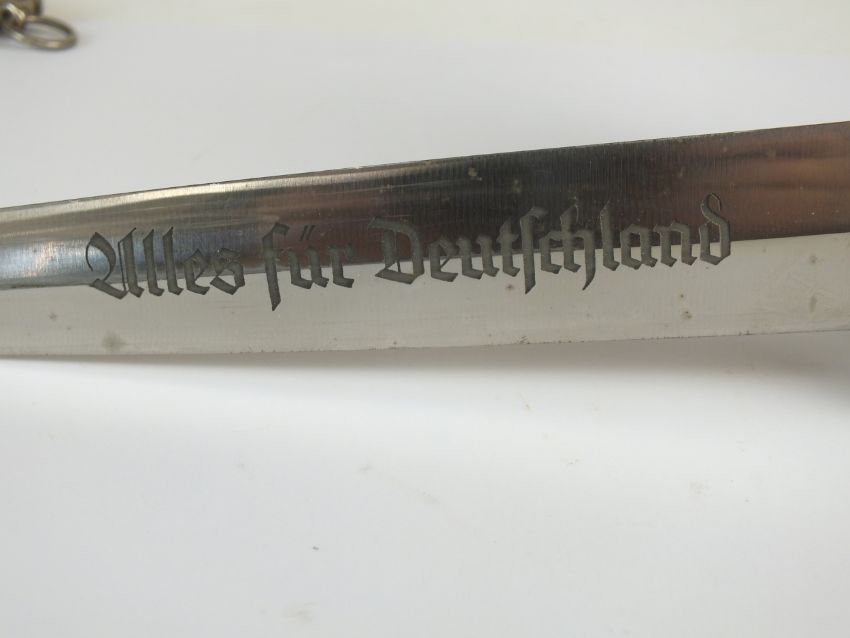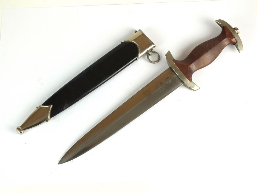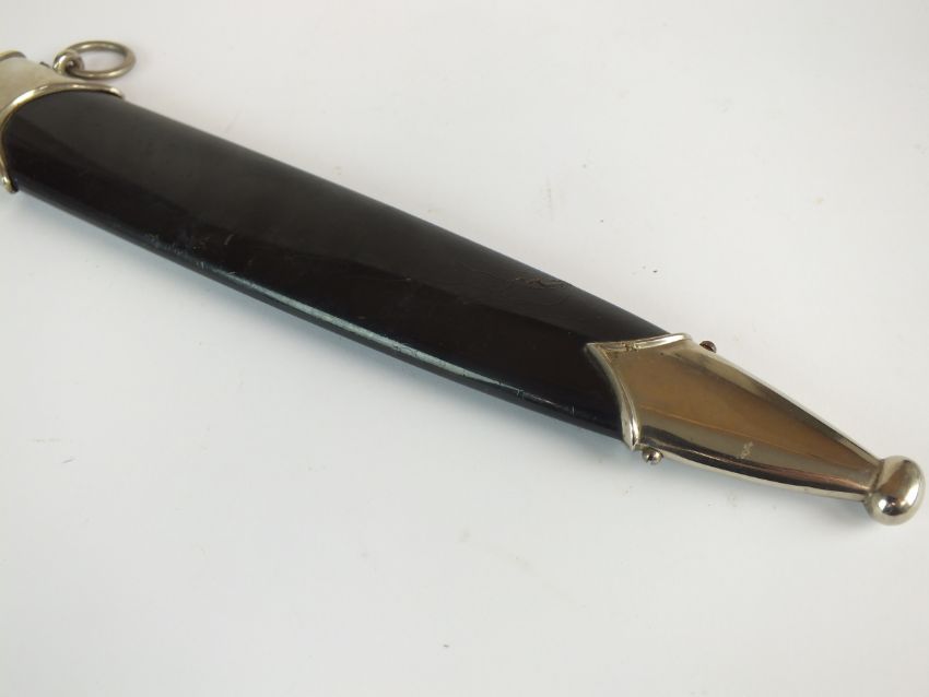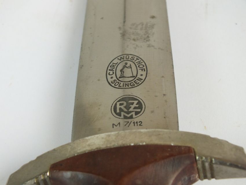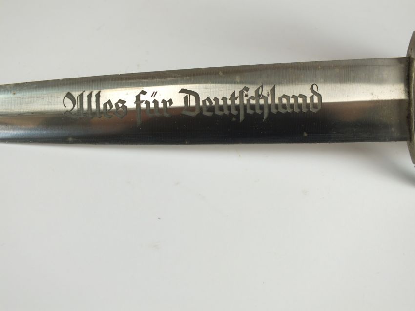 A German Third Reich NSKK Dress dagger by Carl Westhoff Solingen the dark brown wooden grip with inlaid metal eagle and enamel device, the double-edged 22cm long blade etched with standard motto "Alles Fur Deutschland", rear of blade with manufacturers mark and RZM M7/112 logo, housed in a black painted scabbard with single loose suspension ring, overall length of dagger 35cm (chip to handle and verdigris to the eagle)