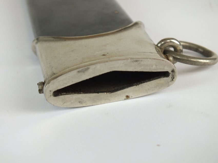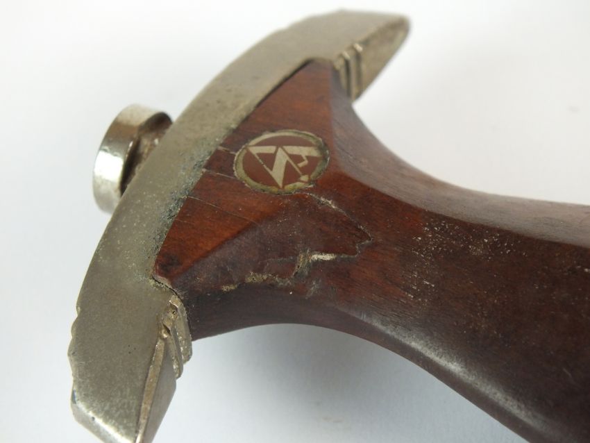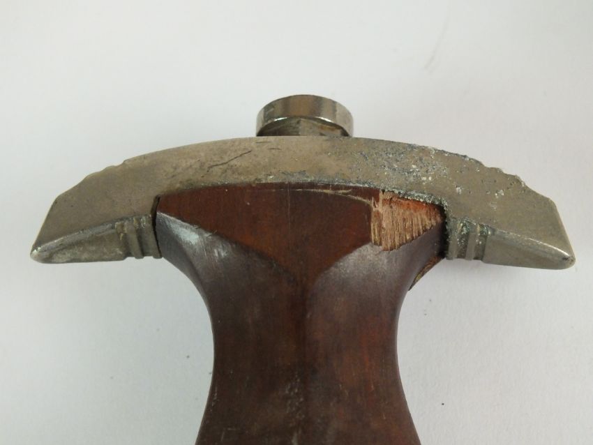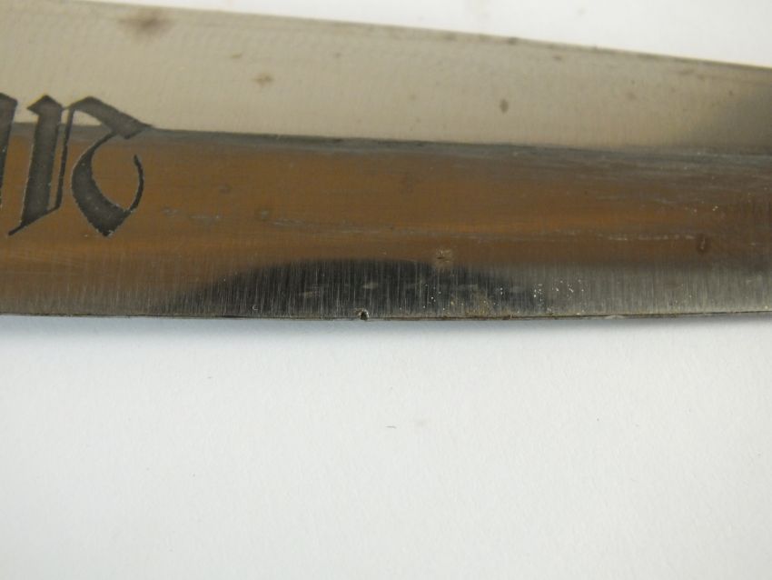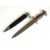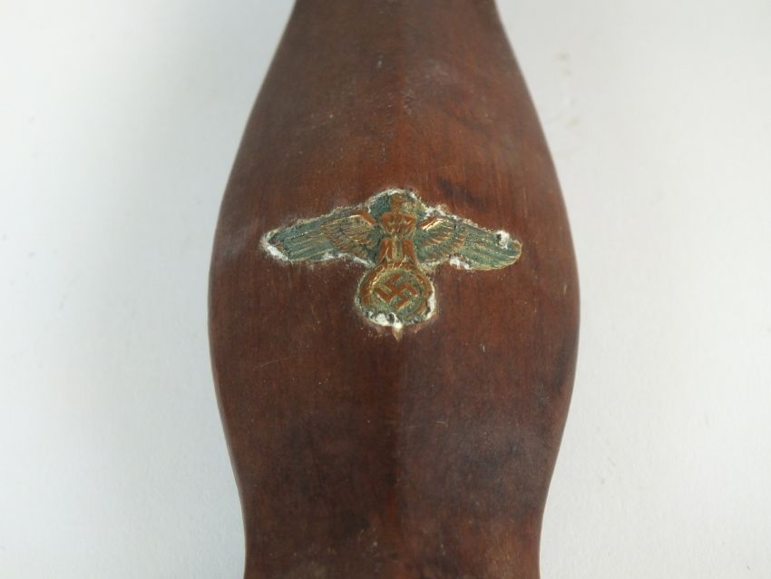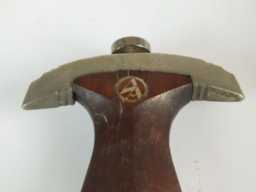 A German Third Reich NSKK Dress dagger by Carl Westhoff Solingen the dark brown wooden grip with inlaid metal eagle and enamel device, the double-edged 22cm long blade etched with standard motto "Alles Fur Deutschland", rear of blade with manufacturers mark and RZM M7/112 logo, housed in a black painted scabbard with single loose suspension ring, overall length of dagger 35cm (chip to handle and verdigris to the eagle)