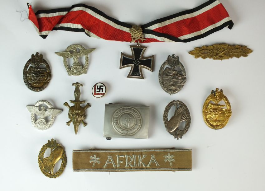 A group of thirteen reproduction and post-war German-style badges, medals and a buckle comprising a Knight's Cross; Recht en Trouw belt buckle; "England Awake" badge; Afrika Korps cuff title; Opfer-ring enamel badge etc (13)