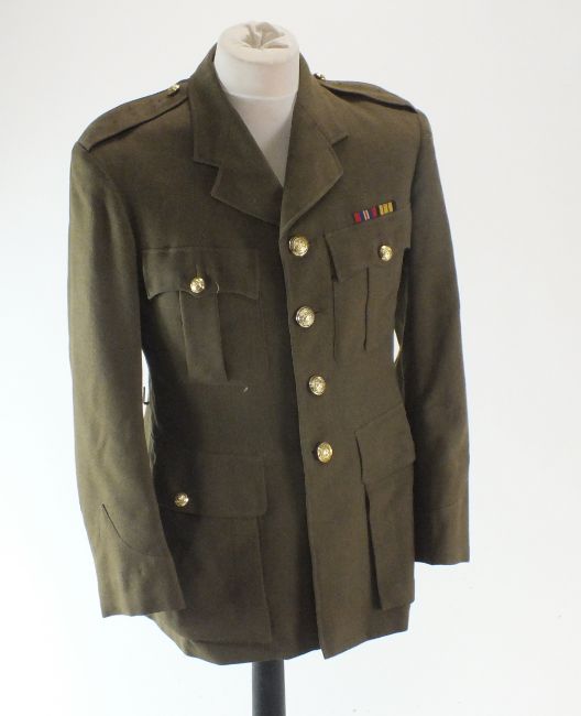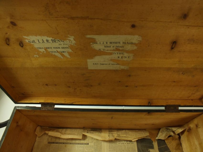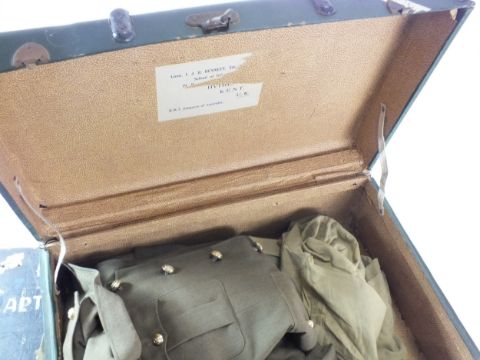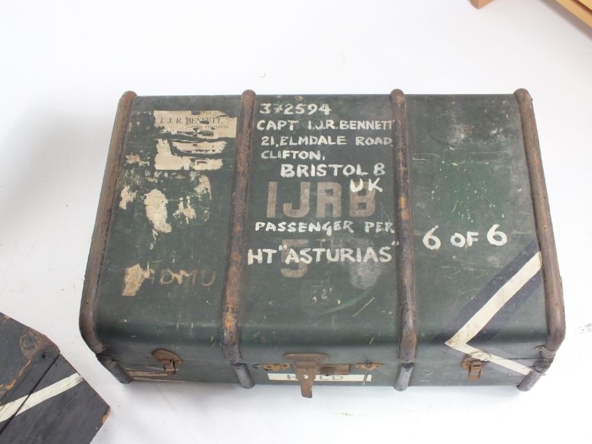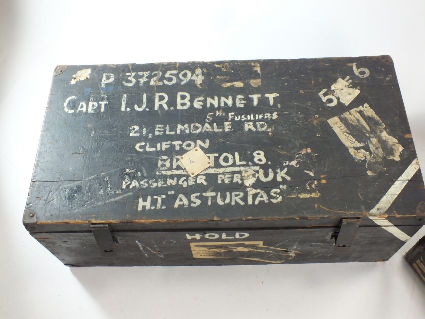 Two British military officers' trunks, containing a selection uniform circa 1952, including jacket with ribbons for the 1939-45 War Medal and Africa General Service medal, collars, shirts, belts, etc Trunk named to Captain I.J.R Bennett 5th Fusiliers, who earned the AGS with Kenya clasp with the Fusiliers.