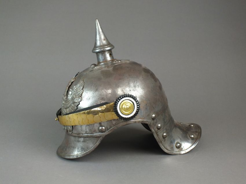 An Imperial German Other Ranks Cuirasser's M15 lobster tail pickelhaube by Juncker of three-piece silvered steel construction with a helmet, visor and extended rear protective neck guard, topped by a spike on mounting base secured by four rivets alongside a Prussian eagle helmet plate. The front visor has a green-painted underside and an upturned lip, held in place by capped rivets to either end. This helmet has a modern replacement incorrect gold/leather chinstrap which is secured by a reproduction tricolour Imperial German cockade to the right and a black and white Prussian cockade to the left. The entire outer edge of the helmet is trimmed in a rolled-around steel band which acts to protect the wearer from the raw edges of the steel. The black-painted interior of the helmet has a brown seven-finger replacement liner (no drawstring) and the interior of the dome is stamped 'C.E. JUNCKER'.