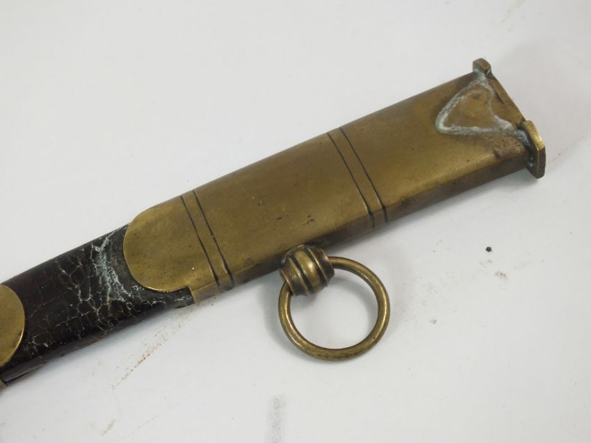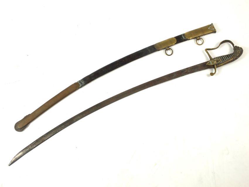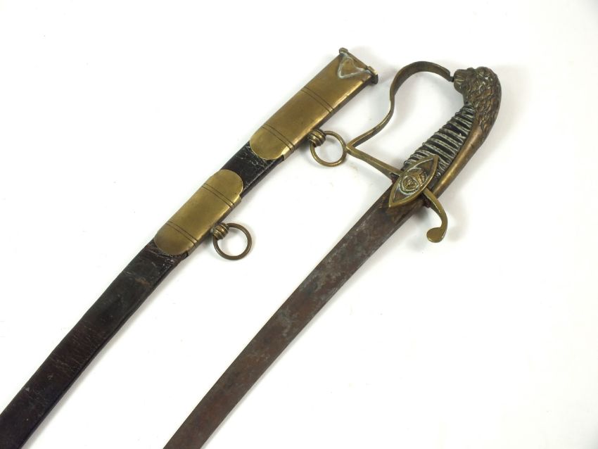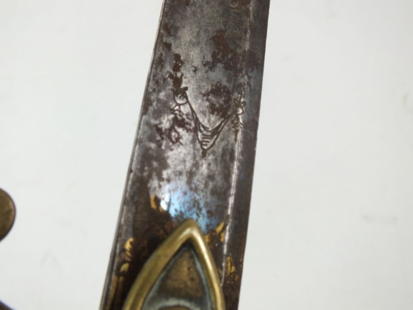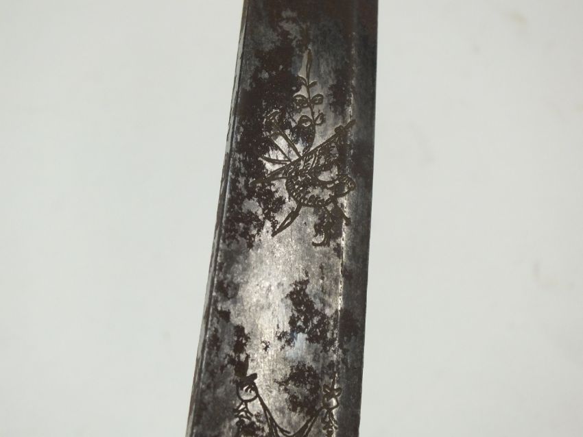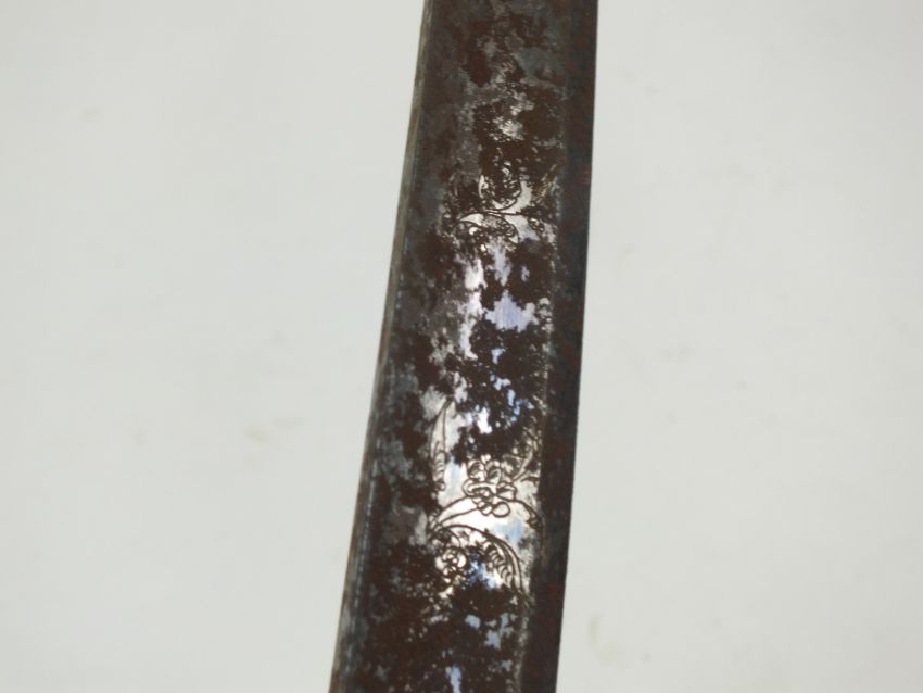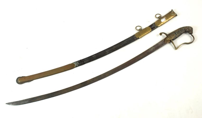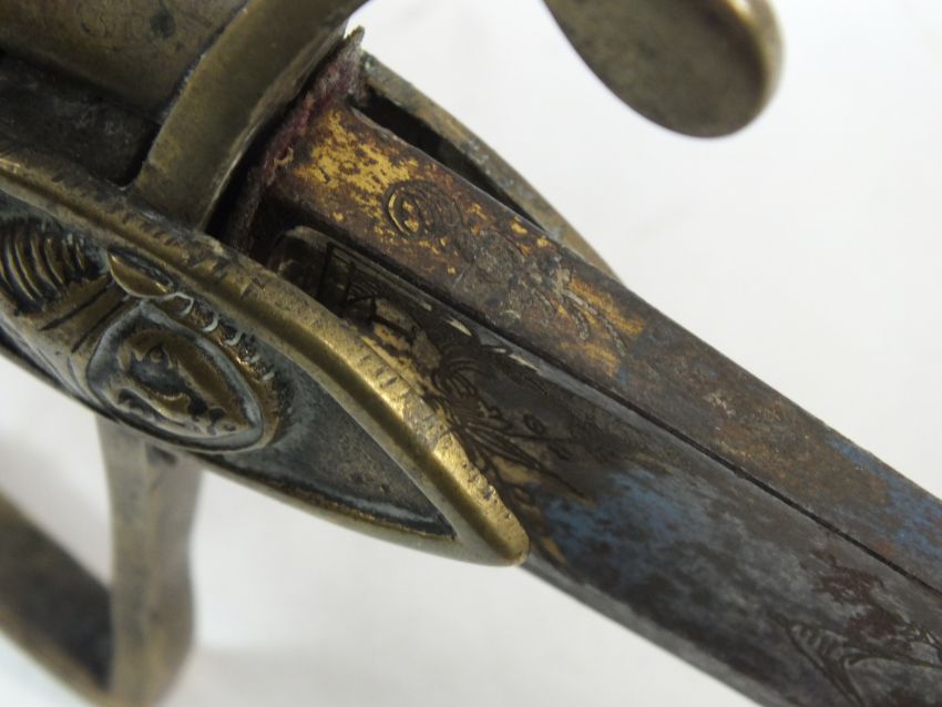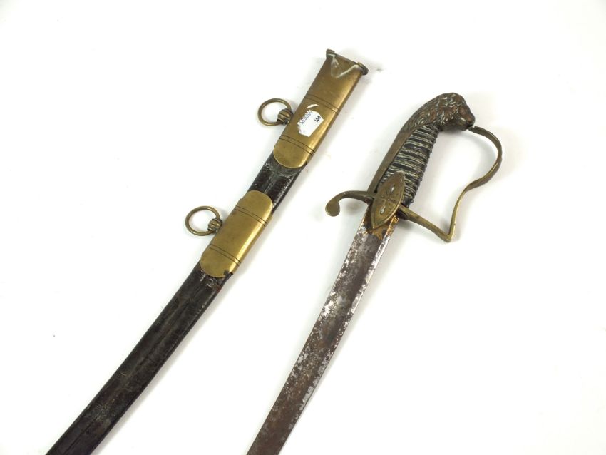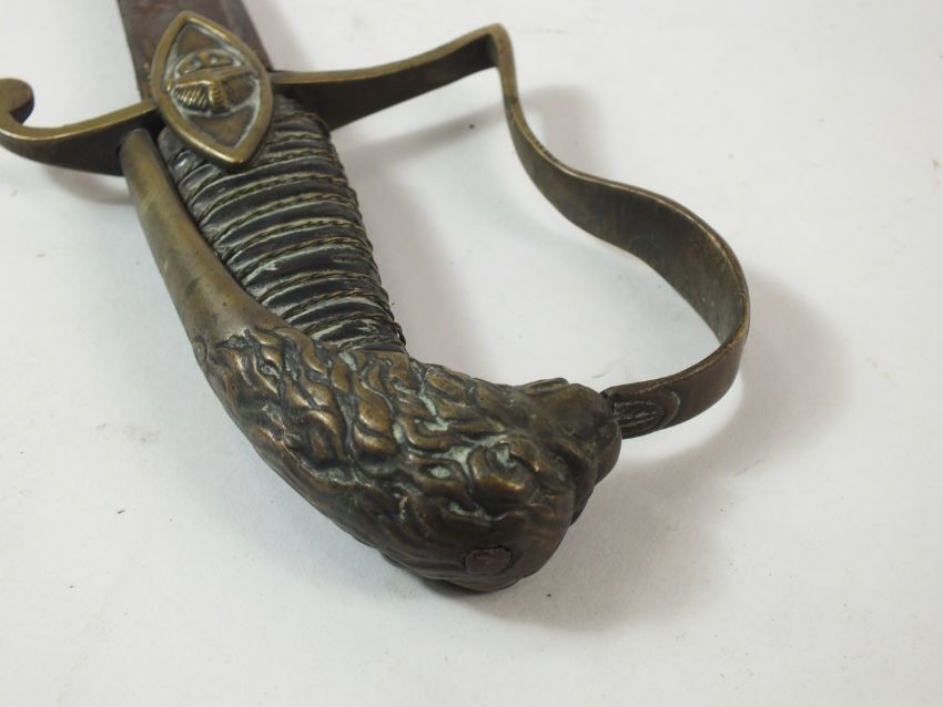 An interesting and unusual private purchase Indonesian (Dutch Colonial) Officer's Cavalry sabre in the European style circa 1830-50 the hilt with a warrior head mascaron to the langet and lion's head pommel, the blade probably by Solingen with etching to 1/4 of the length, further engraved with flowers and a rose to the back-edge, blade length 80cm, overall length 93cm, housed in black leather and brass-mounted scabbard (knucklebow a.f)
