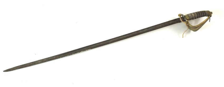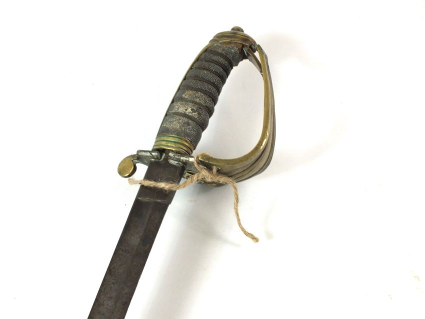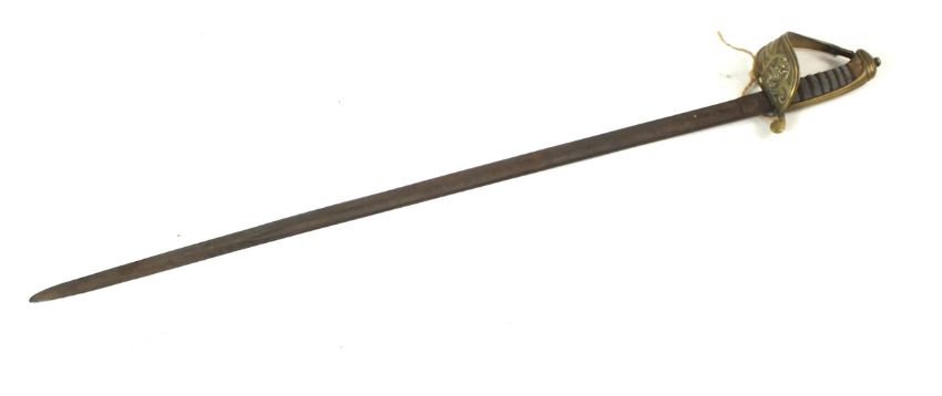 A Victorian 1827 Pattern Royal Naval Warrant Officer's sword the brass dish guard with a fouled anchor below a Victorian crown, shagreen grip bound with wire, plain pommel incorporating the backstrap, blade with proof marks but otherwise unmarked, blade length 79cm, 94cm overall length, lacking scabbard (hilt a.f)