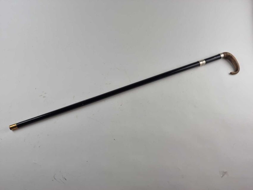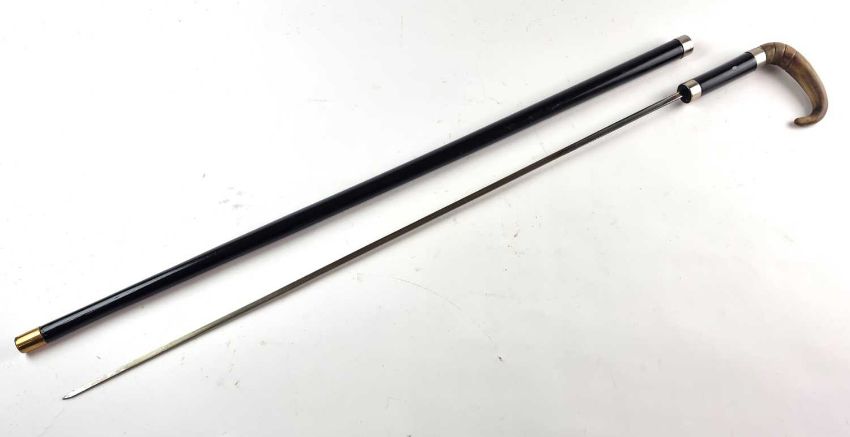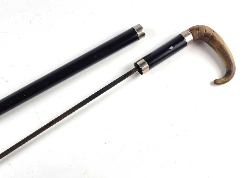 A late 19th-century black lacquered gentleman's sword cane, with a horn handle, the handle pulling to reveal a 67cm long blade, overall length 86cm