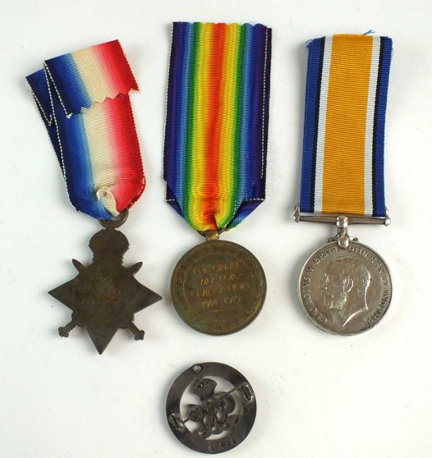 A First World War trio of medals awarded to "16479 Pte. E. Lewis Welsh R." comprising 1914-15 Star, War Medal and Victory Medal, together with a silver war badge numbered 13869