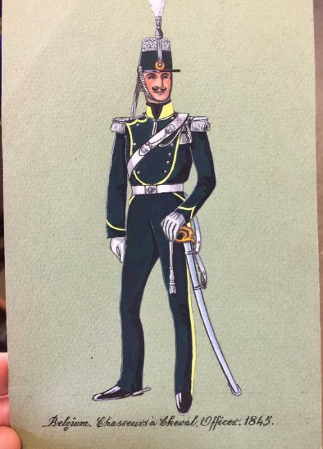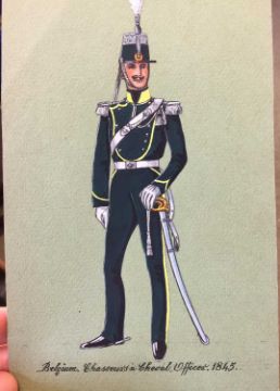 A.H Bowling (20th century), three military watercolour uniform studies comprising Belgian Chasseurs à Cheval, Officer, 1845, unsigned; Regiment Waldstein, 1795 unsigned; and Major of 3rd Cavalry, 1870, signed, each unframed, 20.4cm x 12.7cm (3)