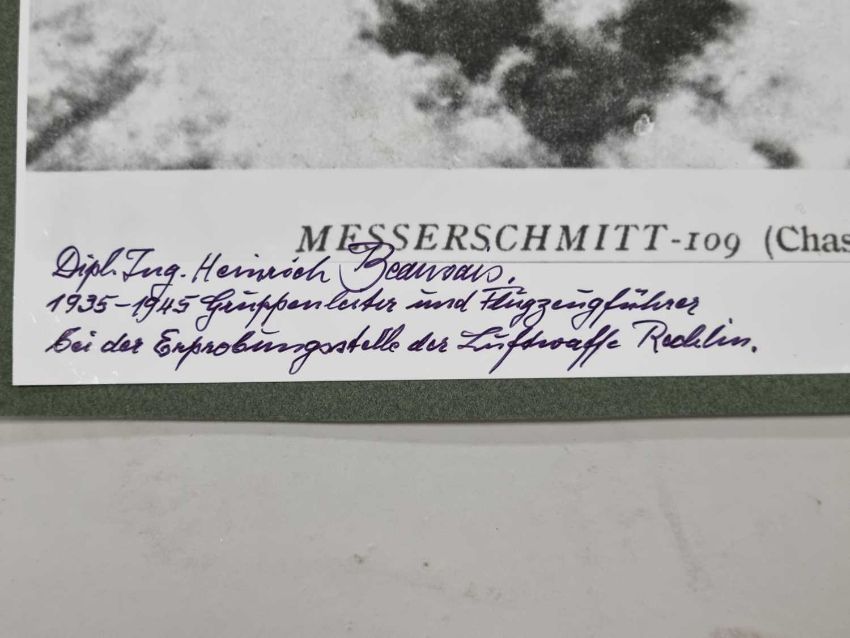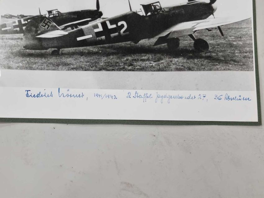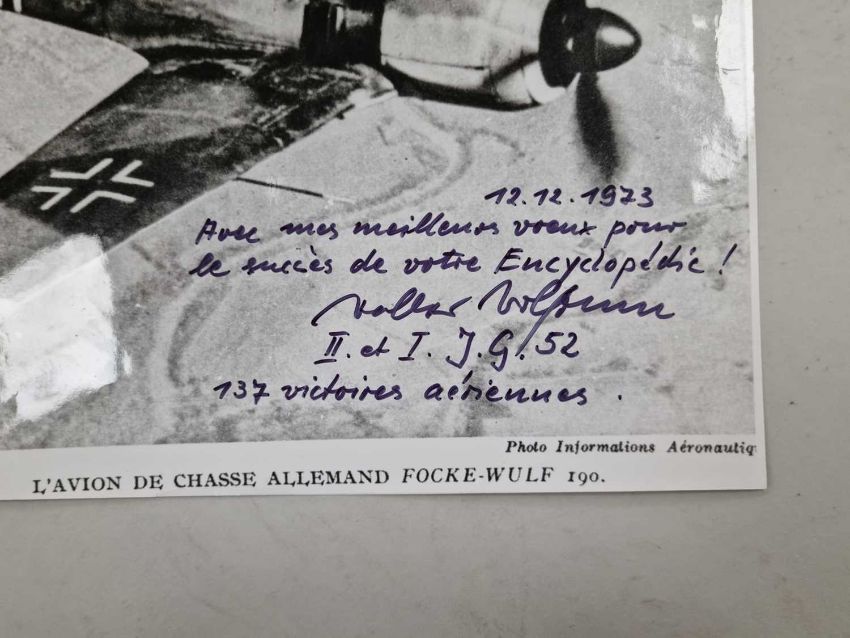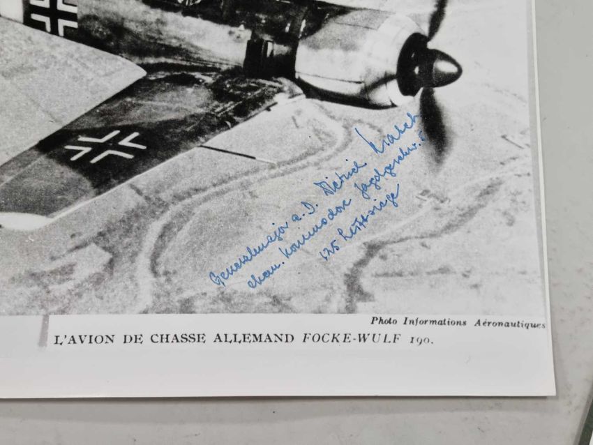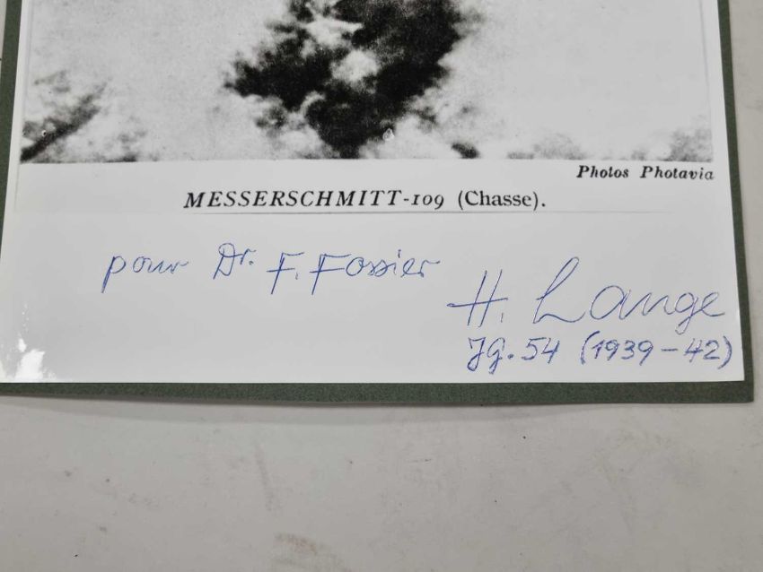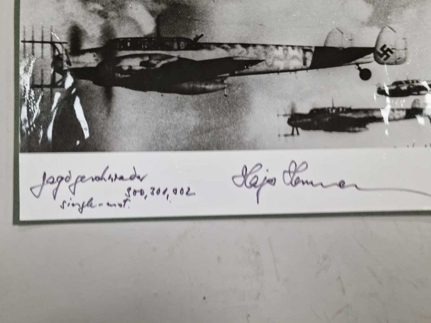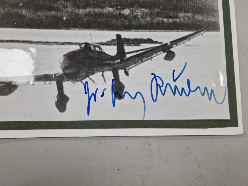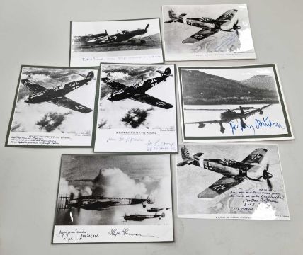 A small group of large format photographs, individually signed post-war by various German Luftwaffe pilots, all but one of them Knight's Cross winners. Comprising Hans-Ulrich Rudel (only recipient of the Knight's Cross with Golden Oak Leaves, Swords and Diamonds), Dietrich Hrabak, Heinz Lange, Hajo Herrmann, Walter Wolfrum, Friedrich Korner and Heinrich Beauvais (test pilot).