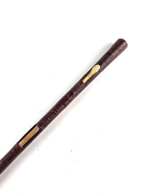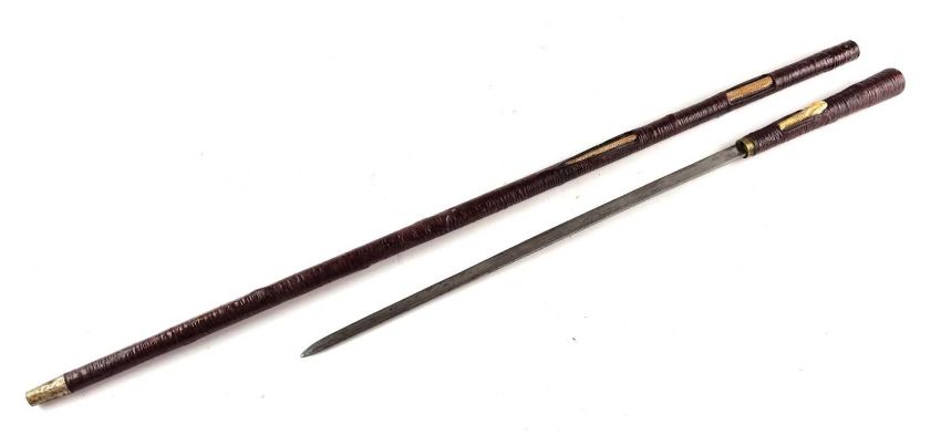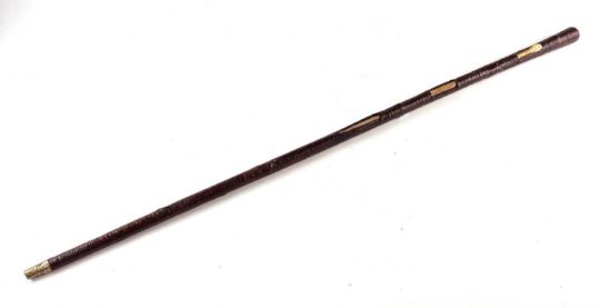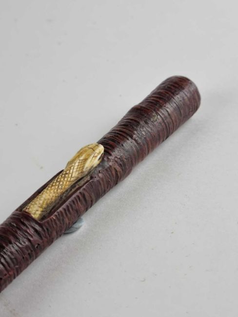 An unusual Indian sword cane, circa 1900, the lacquered simulated bamboo body with a trailing snake, formed of a carved bone head with a sandalwood body and tail, with a white metal ferrule, the cane opening via a push release button to reveal a 40cm single-edged blade, overall length 89cm