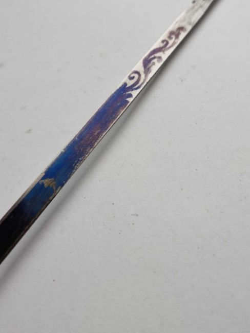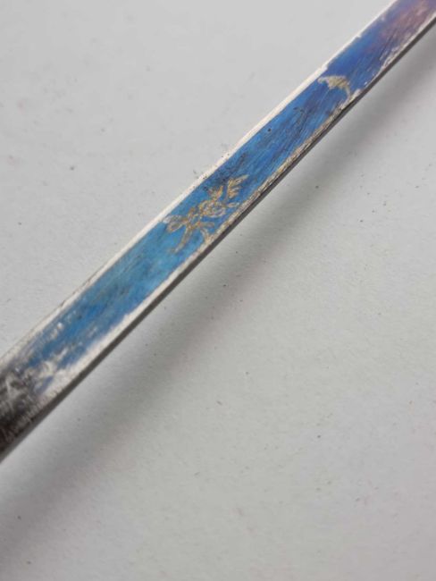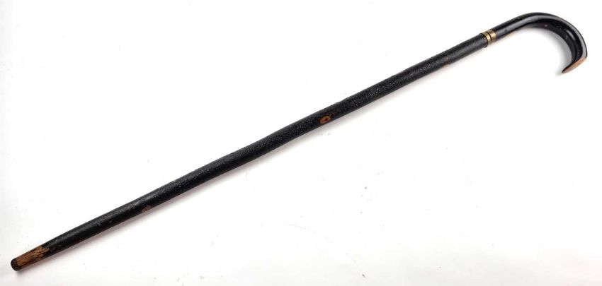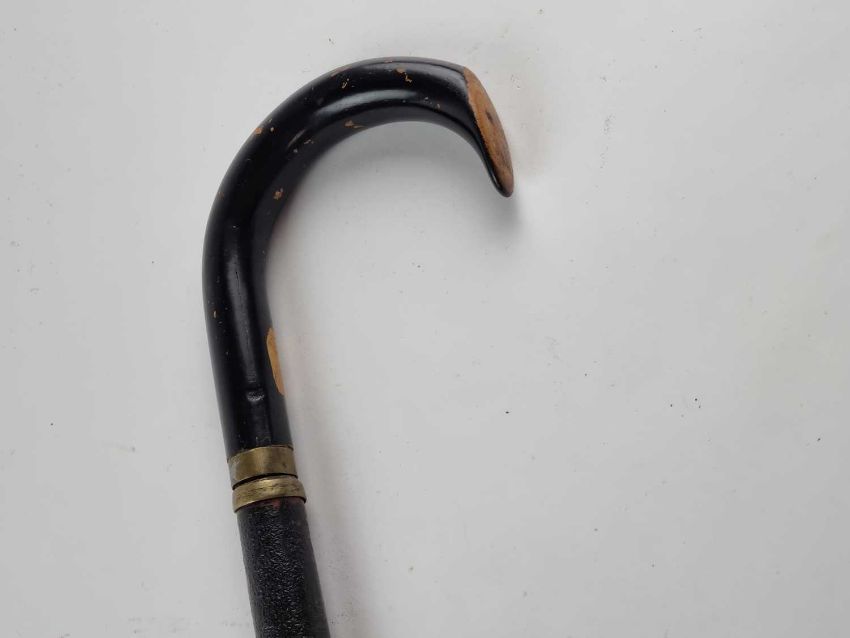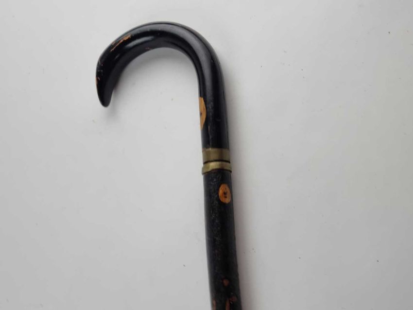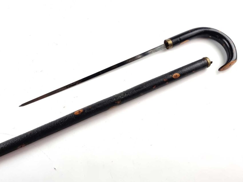 A Victorian gentleman's sword cane, with a lacquered black wooden shaft and a handle pulling out to reveal a 34cm long blued single-edged blade with scroll decoration