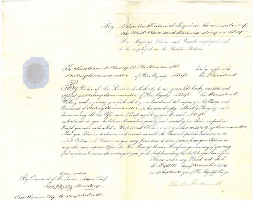 Royal Navy. A pre-printed commission, 8th November 1854, with manuscript insertions, appointing Lieutenant Henry A Hollinworth to be Acting Commander of HMS President (1829), with papered seal to left margin, signed by Admiral Charles Frederick (1797-1875) and counter-signed by a secretary, together with a further notation regarding Acting Commander Matthew Connolly's transfer to replace Frederick on HMS Amphitrite (1816).
