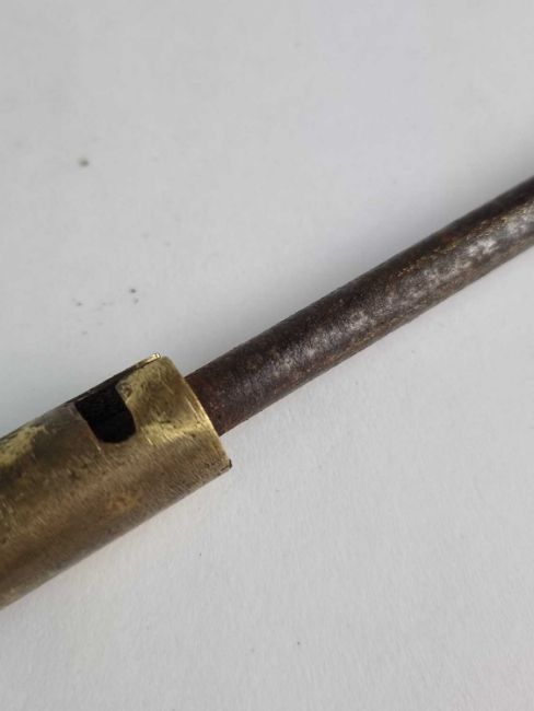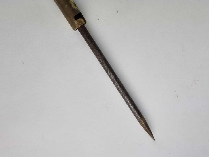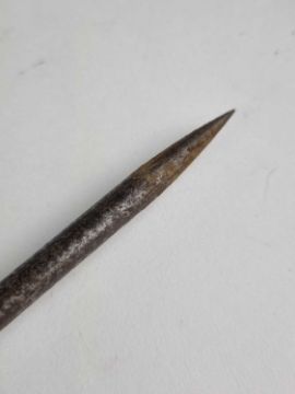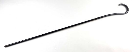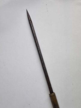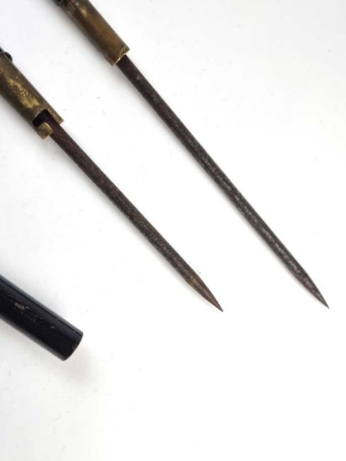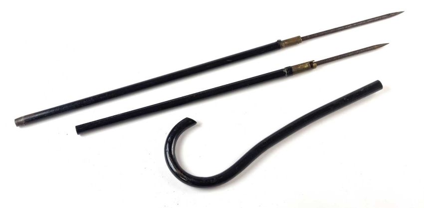 An early 20th-century metal sword cane, pulling apart to three pieces to reveal two separate blades or pig stickers, 12cm and 17cm long, overall length 99cm