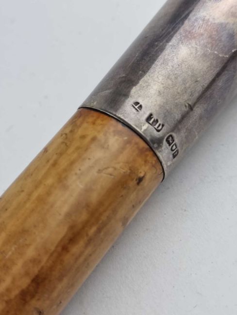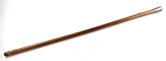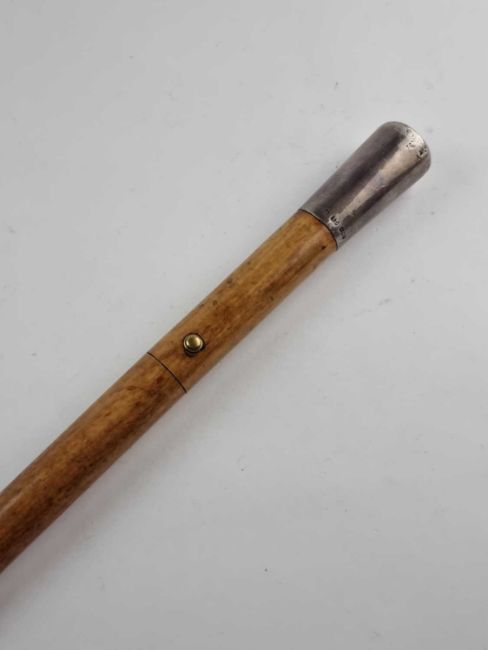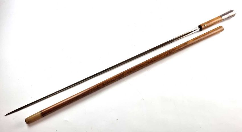 A gentleman's malacca sword cane, with a London silver top hallmarked for Thomas Davis (stick maker) 1912, horn ferrule, the handle with a push button release to reveal a 74cm long blade, overall length 91cm