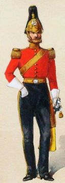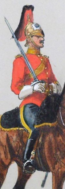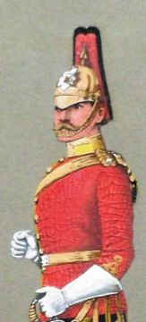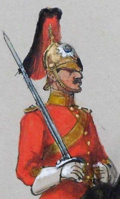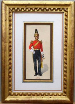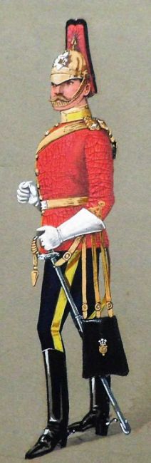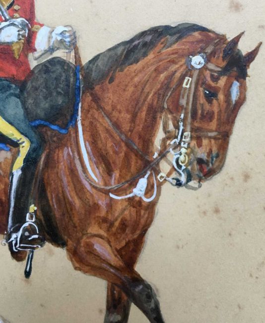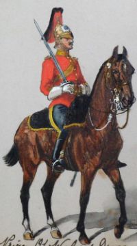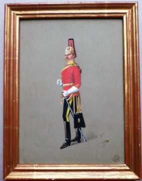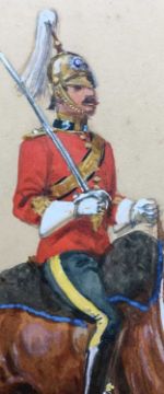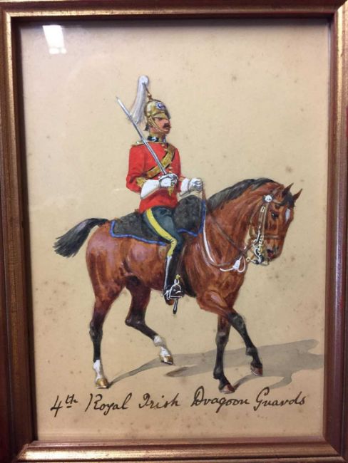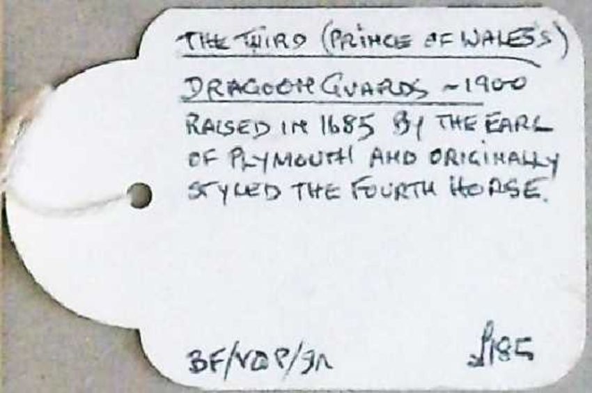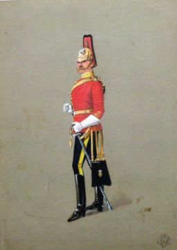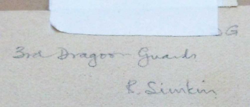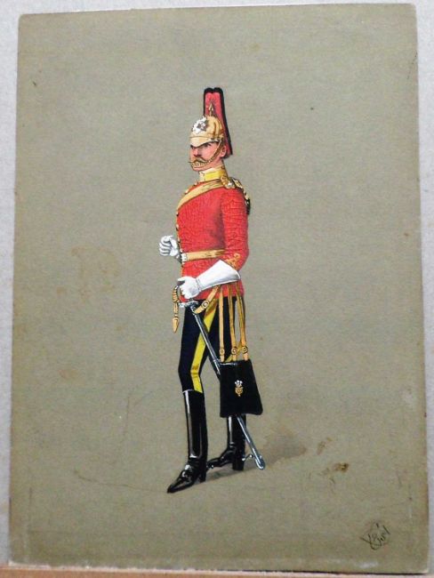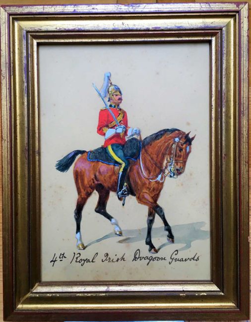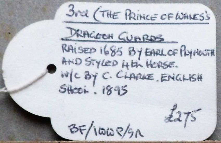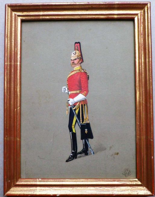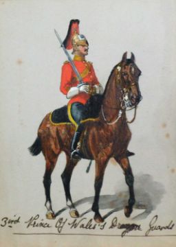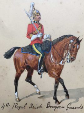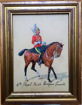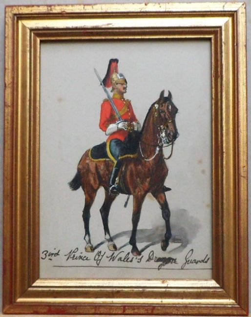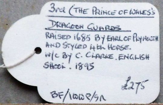 C. Clarke (English School, circa 1895), An Officer of the 3rd Dragoons, monogrammed lower right, 164mm x 118mm, 197mm x 151mm framed; together with three attributed to Richard Simkin (1850-1926), comprising a 'Mounted Officer, 4th Royal Irish Dragoon Guards (Blue Horse) Full Dress', titled, unsigned, 170mm x 122mm, 220mm x 173mm, framed; a 'Mounted Officer 3rd (Prince of Wales) Dragoon Guards', Full Dress, circa 1910, unsigned, titled, 170mm x 122mm, 220mm x 173mm framed; and Officer of the 2nd Dragoon Guards, 1854 (Black Plume) unsigned, 196mm x 126mm, 242mm x 175mm framed