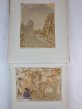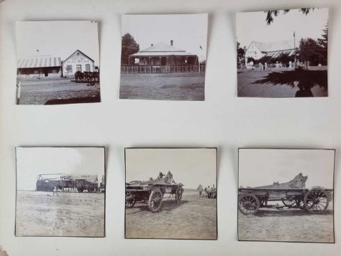 Album missing rear board and spine, front board is detached. Pages are now loose as a consequence. The boards are very worn. Some of the larger photographs are creased/folded and/or damaged. Some pages with tears to corners. The large photograph of Boer Commandos has a tear.