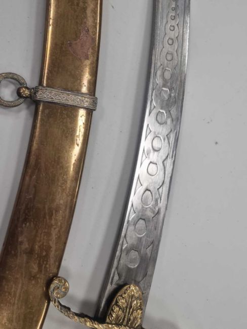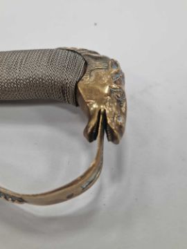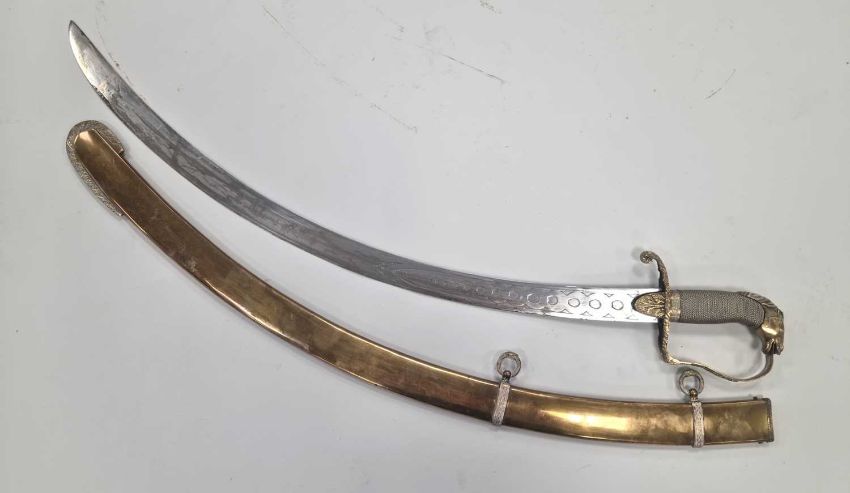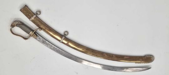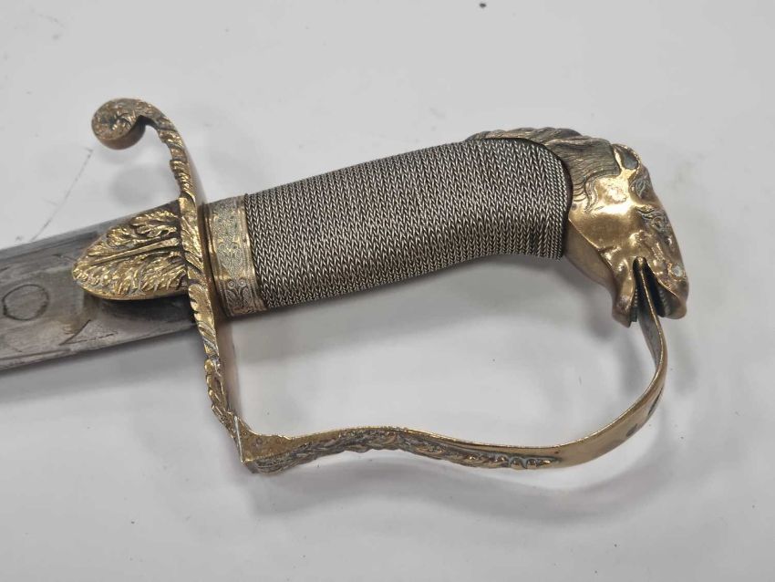 A nice quality Indian-made sabre and scabbard in the Georgian British Cavalry style, 20th century, constructed of brass with a horse head handle and wirebound grip, overall length 82cm