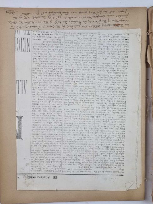 Scrap album in poor condition, rear board missing, pages detached. Edges of pages frayed and torn.