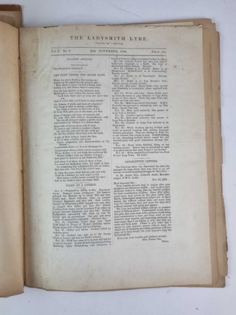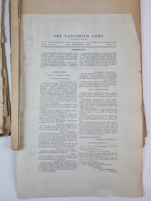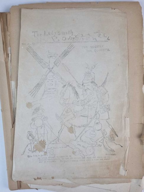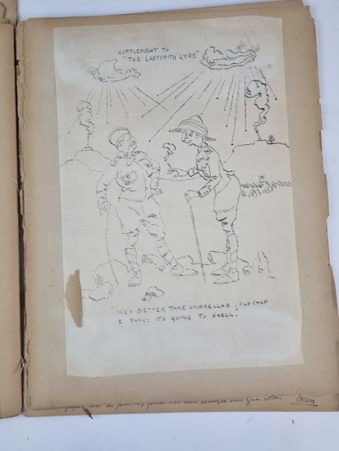 Sold together with a small scrap album of humorous illustrations, ditties and poems; 'The Ladysmith Bombshell' depicting Slim Piet (Piet Joubert), with various humorous and topical stories or comments, including one that reads ' £10 Reward to the first Boer who enters Ladysmith in any capacity other than Bearer of a white flag or as prisoner of war'; two copies of the Ladysmith Lyre dated 27th and 30th November 1899, with some additional illustrative supplements; a comical watercolour sketch of the forces surrounding those holed up in Ladysmith; a copy of De Zoottansberg Watcher dated 11th April 1901, with an inscription below that reads 'The Zoottansberg Watcher was published by the Boers in Pietersburg up to the occupation of the place by the British - the night of the occupation the Boer printers and compositors were made to print off the above copy of the paper, and the printing press was then destroyed with the gun cotton'. (newspaper copy inscribed to 'Major Macready, 2nd Gordon Highlanders')