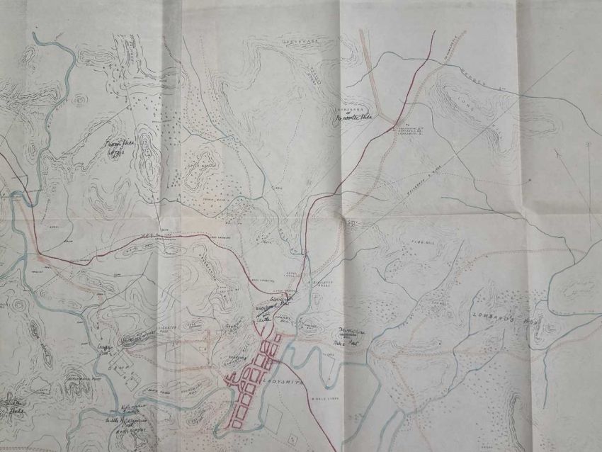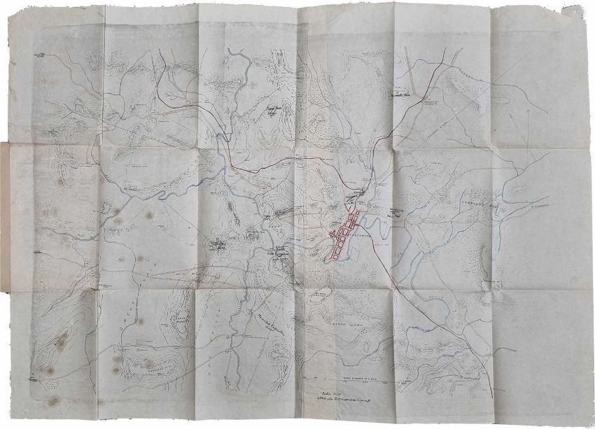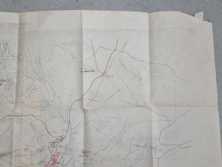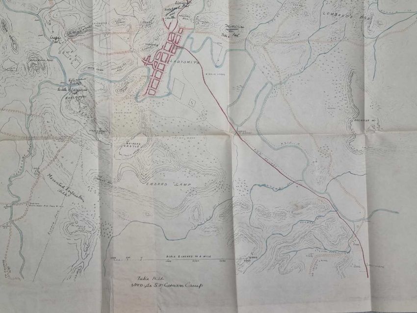 A rare military map of Ladysmith, inscribed in pencil 'O.C of Gordon' to the reverse, showing Table Hill 6000 yards south of Caesars Camp, printed with some over-written and further handwritten annotations in black ink, e.g. 'Mounted Infantry Hill' and 'Devonshire Hill Post', overall dimensions 84 x 60.5cm, two sheets pasted together, scale of 2 inches to the mile.