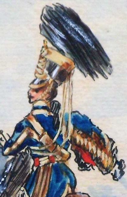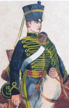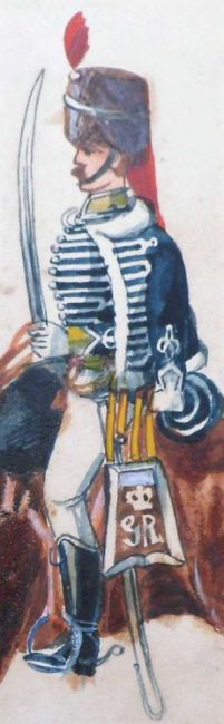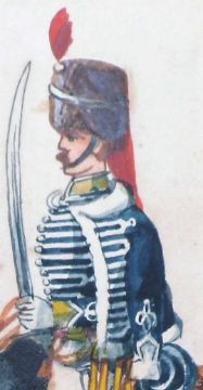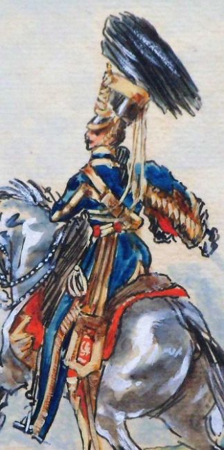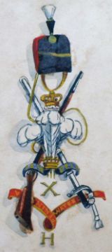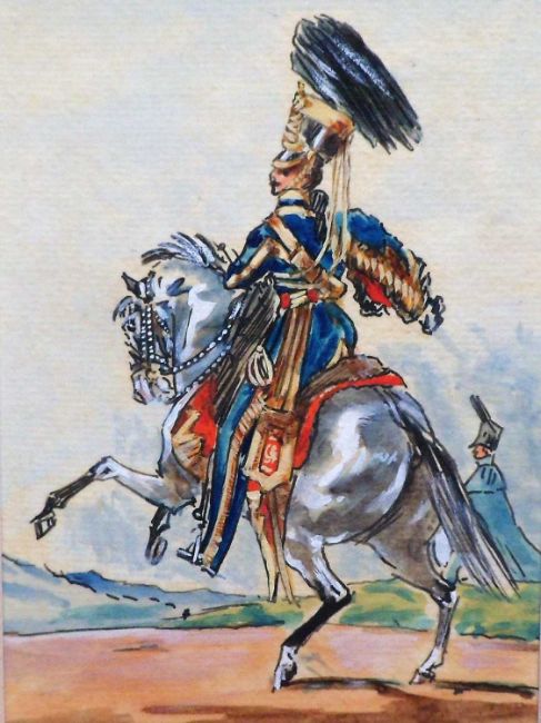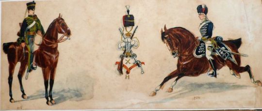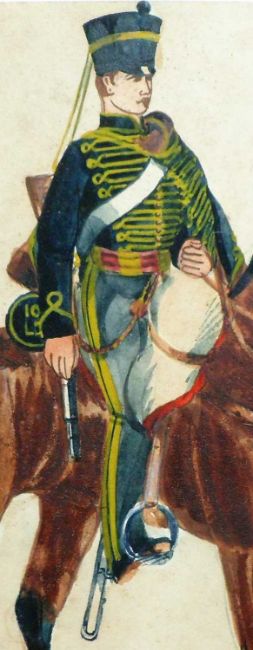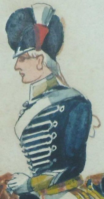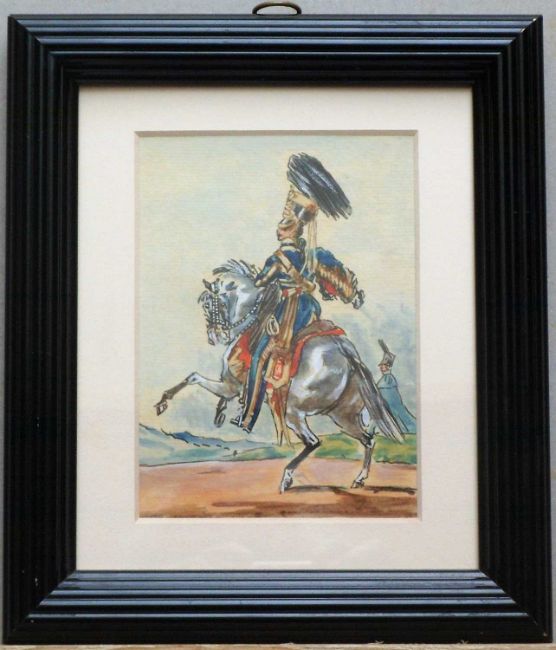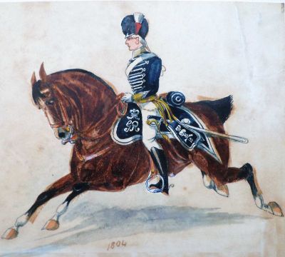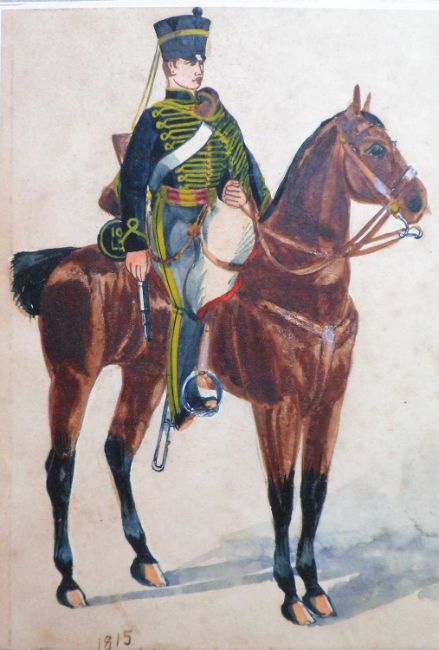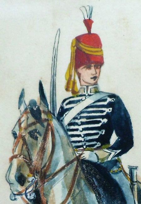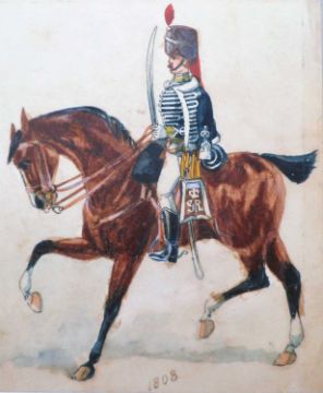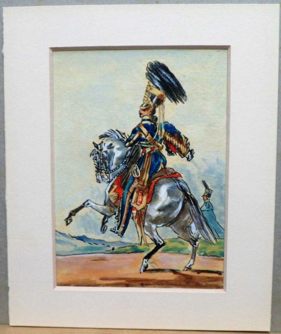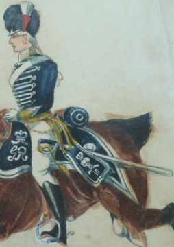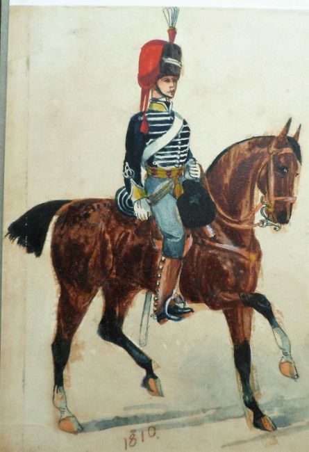 English School, circa 1900, A Mounted Officer from the 10th Hussars, watercolour, unsigned, 140mm x 100mm, 230mm x 198mm (framed); together with two further English School watercolours, circa 1910, of mounted 10th Hussars Troopers, illustrating an 1804 Trooper, 1808 Officer, 1810 Trooper and 1815 Trooper