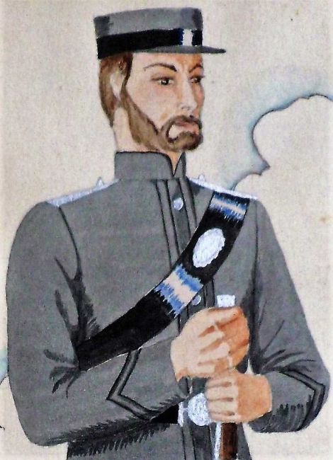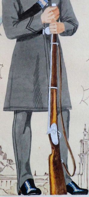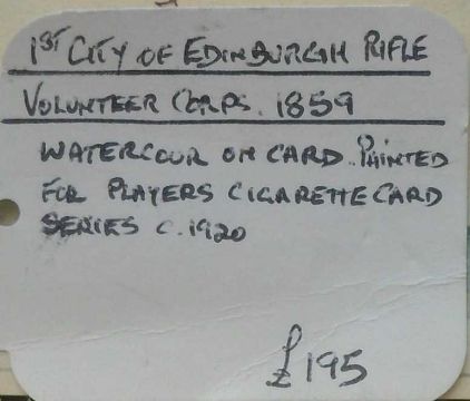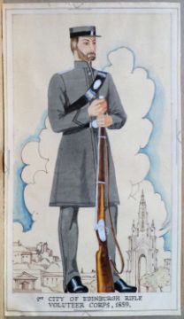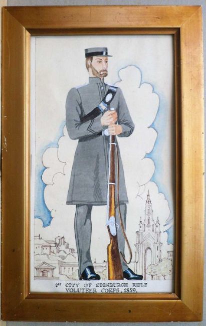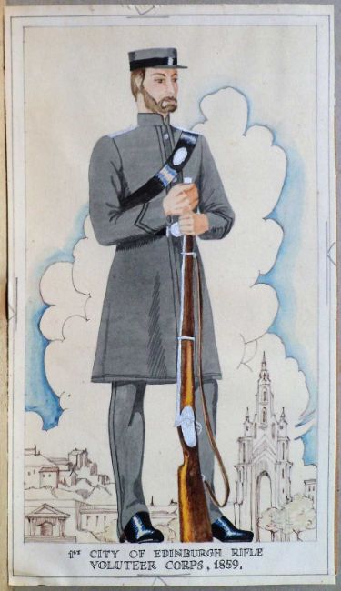 '1st City of Edinburgh Rifle Volunteer Corps, 1859', possibly the original watercolour designed for Players Cigarette Cards (Uniforms of the Territorial Army) First issued in 1939, No.10 of a set of 50, unsigned,