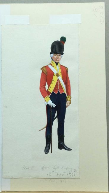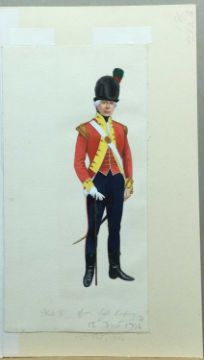comprising 'Officer, Light Company, 12th (Suffolk) Regiment of Foot, 1796', watercolour, titled to mount, unsigned, 330mm x 120mm, 482mm x 272mm including mount, unframed; and a 'Field Officer, 43rd (Monmouthshire) Regiment of Foot 1823', watercolour, titled, unsigned, 329mm x 144mm, 480mm x 293mm including mount, unframed. Both designed for a set of Infantry Regimental Uniforms (1790-1850) prints published by Hugh Evelyn in 1966.